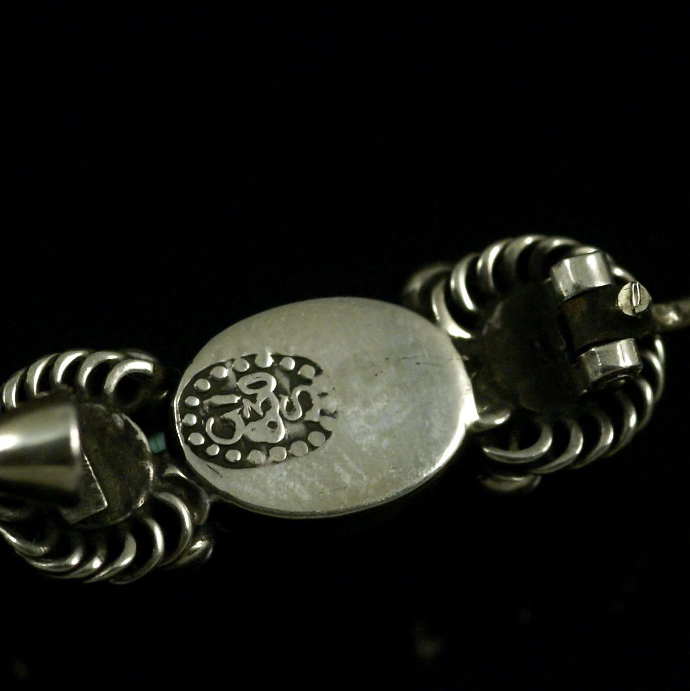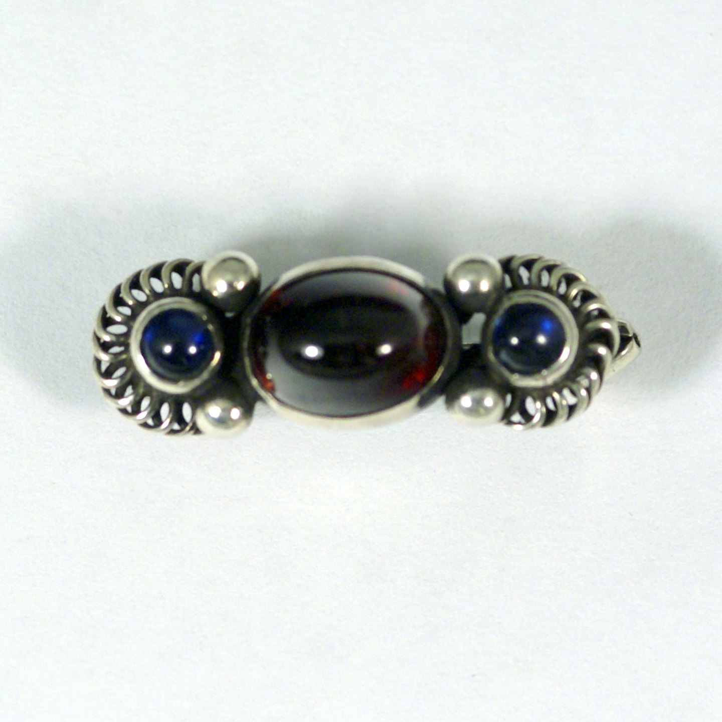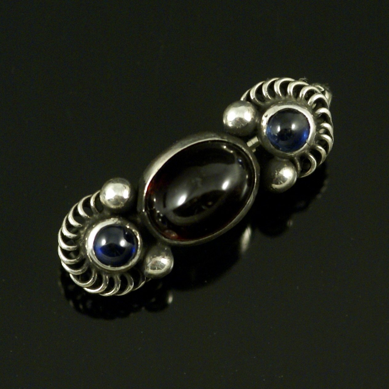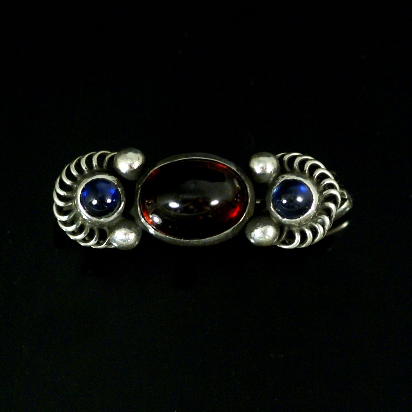 Georg Jensen Skønvirke Broche i Sølv med granat og blå safirer. 1915-27.