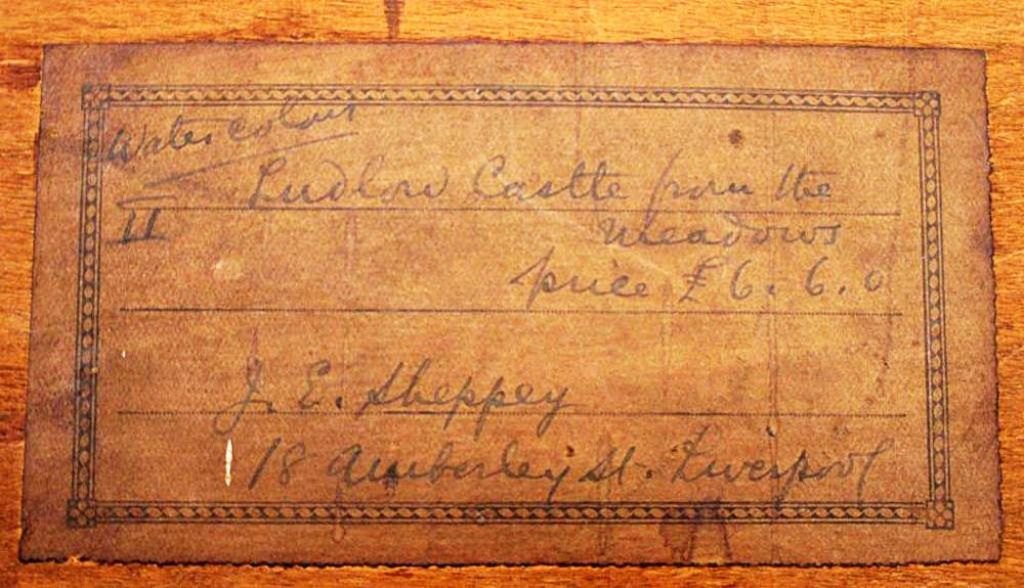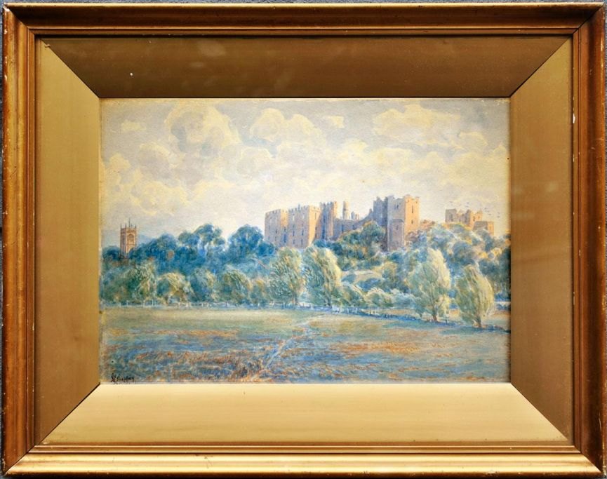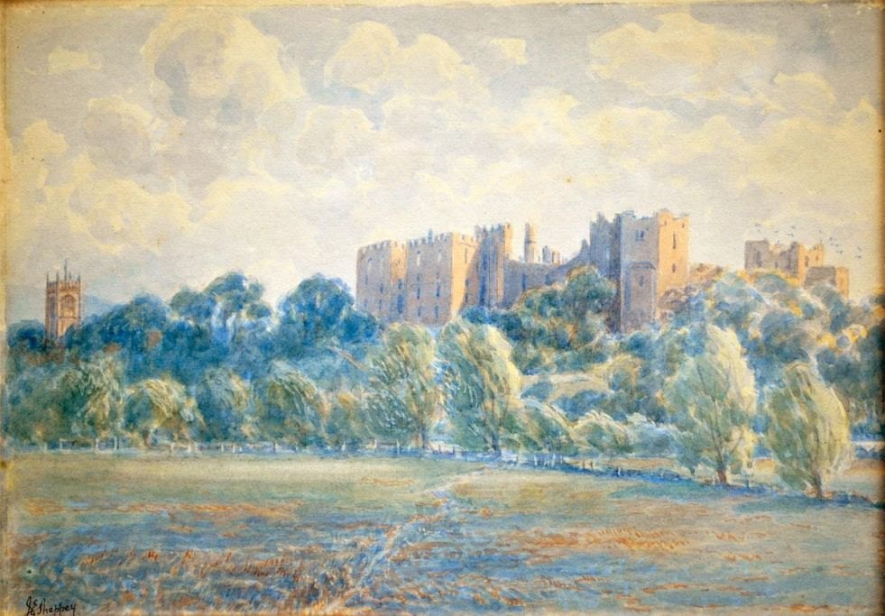Sheppey, J. E (19. årh.) England: Ludlow Castle from the Meadows. Akvarel. Signeret: J. E. Sheppey. 26 x 37 cm.