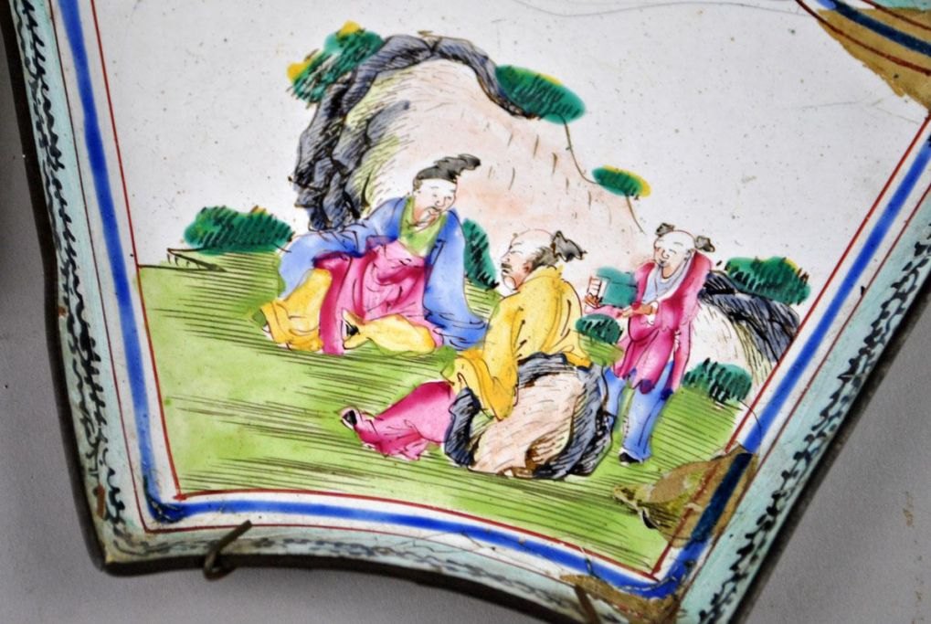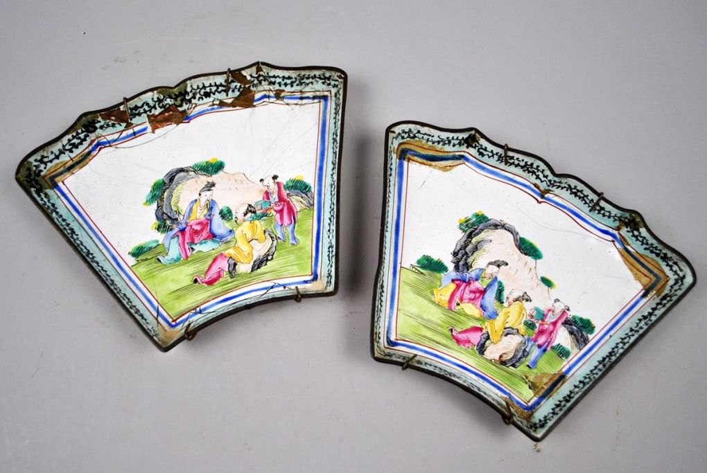 Et par kinesiske skåle fra et kinesisk Canton emaljeret middags sæt. 19. årh. Dekoreret med personer i landskab. 16 x 12 cm. Signeret.