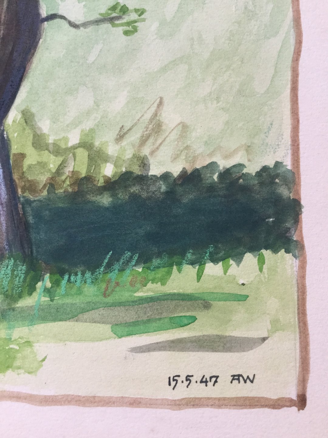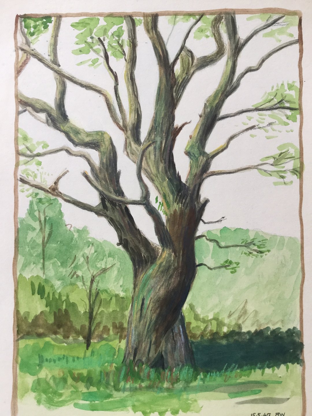 Akvarel af A. Weber 1947 - Gammelt træ.