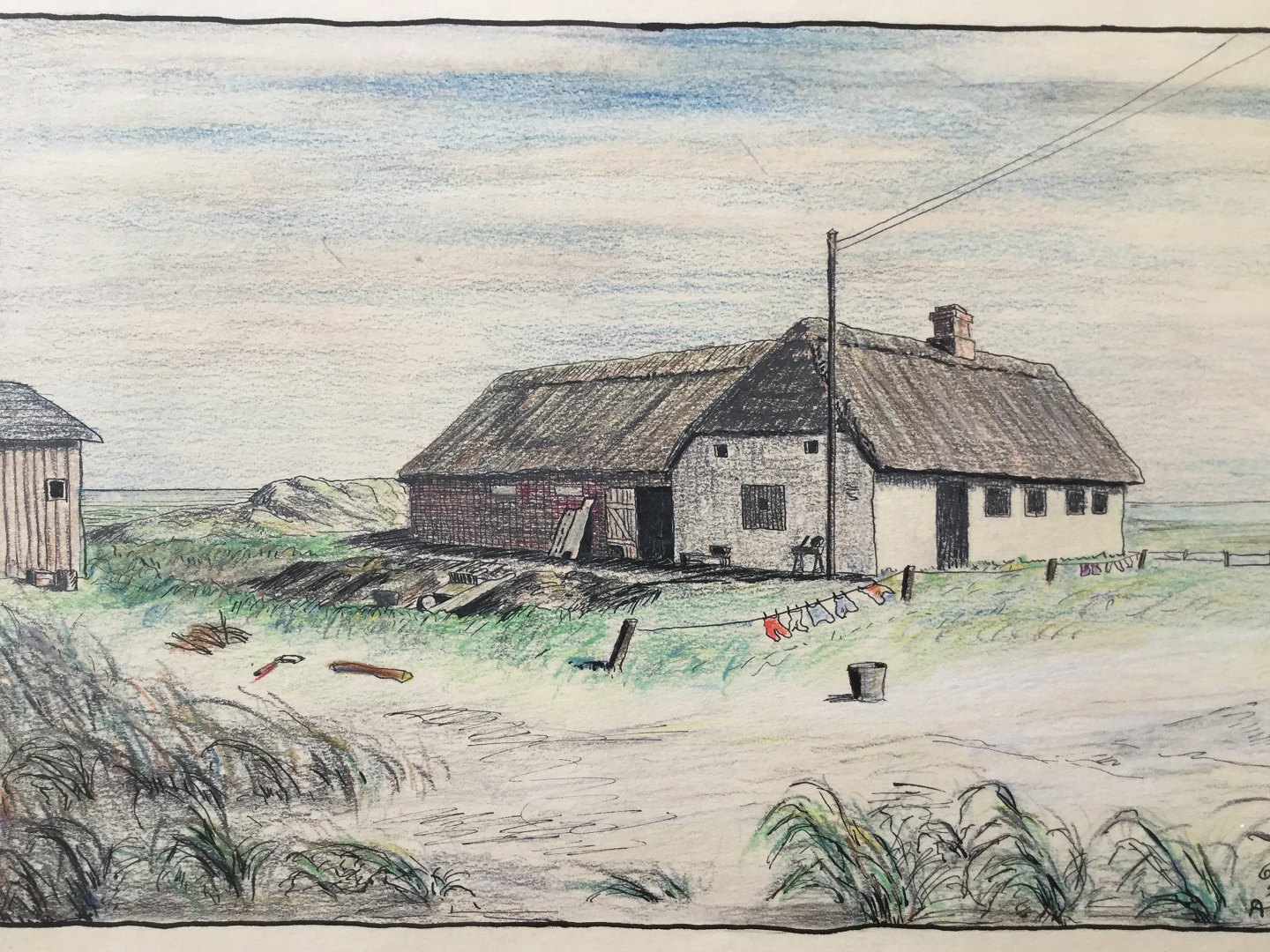 Tegning af A. Weber 1929 - Fiskerhus ved kysten.