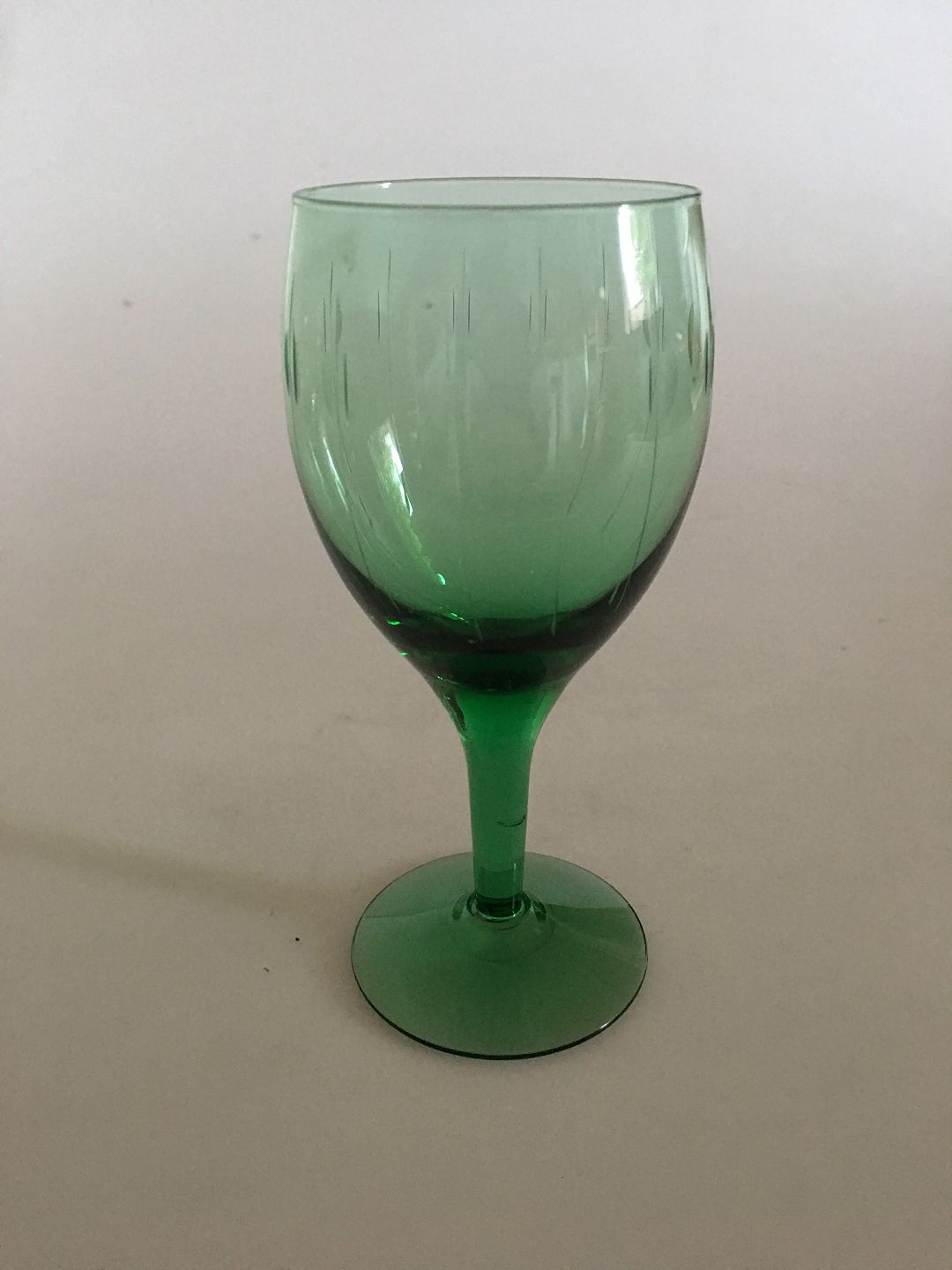 Kirsten Pil Grønt Hvidvinsglas fra Holmegaard. 13 cm H. Glasset er slebet med en kugle brudt af en lodret streg. Designet af Per Lütken i 1956.