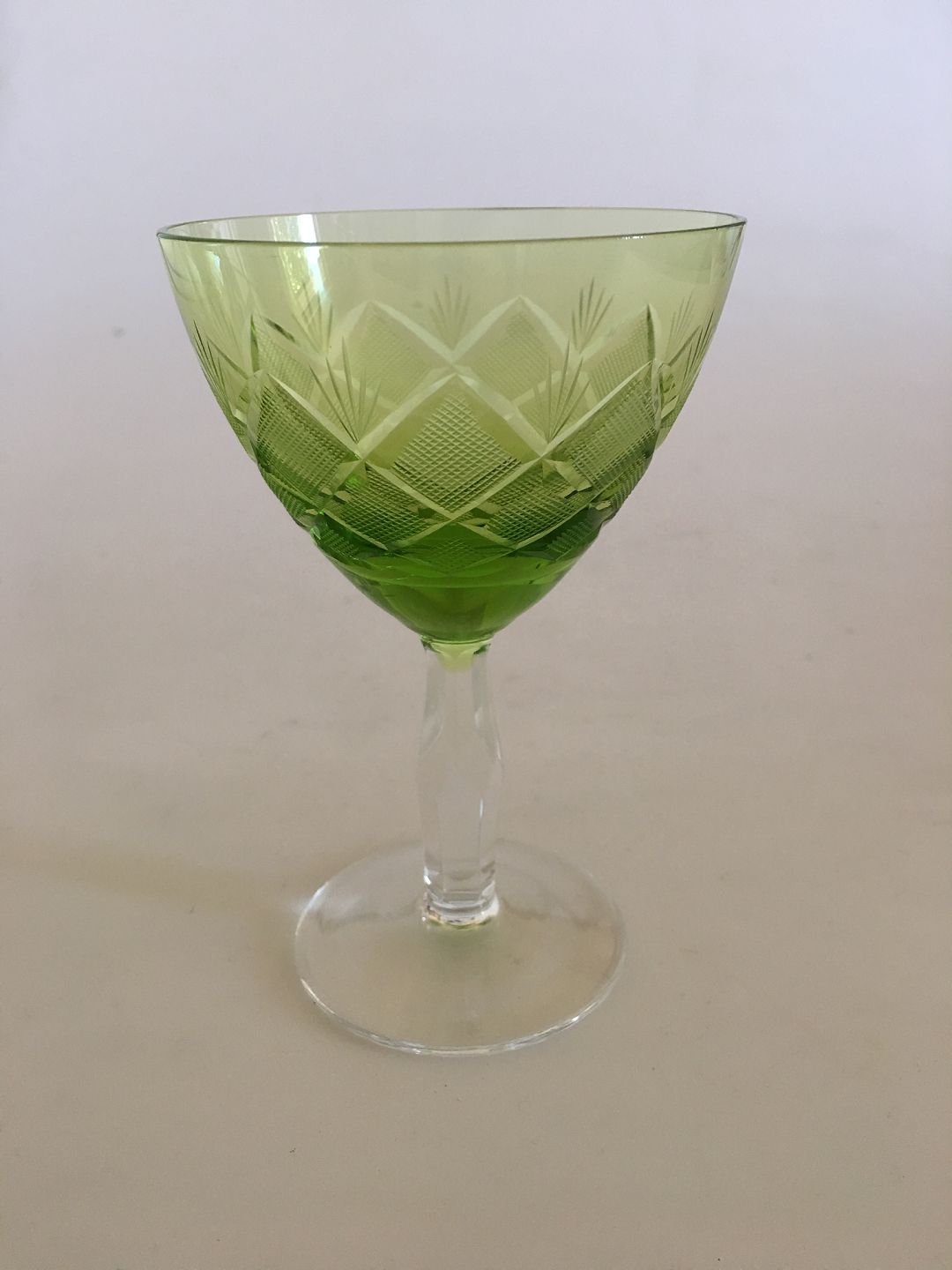 "Wien Antik" Grønt Hvidvinsglas fra Lyngby Glas. 12 cm (4 23/32 in). Krydsslebet kumme med facetslebet stilk. Fra omkring 1956.