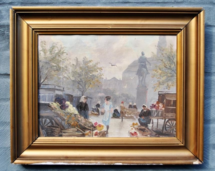 Fischer, Edmund (1889 - 1952) Danmark.: Højbro Plads, København. Med blomstersælgere. Olie på lærred. Signeret. Edm Fischer.  30 x 40 cm.