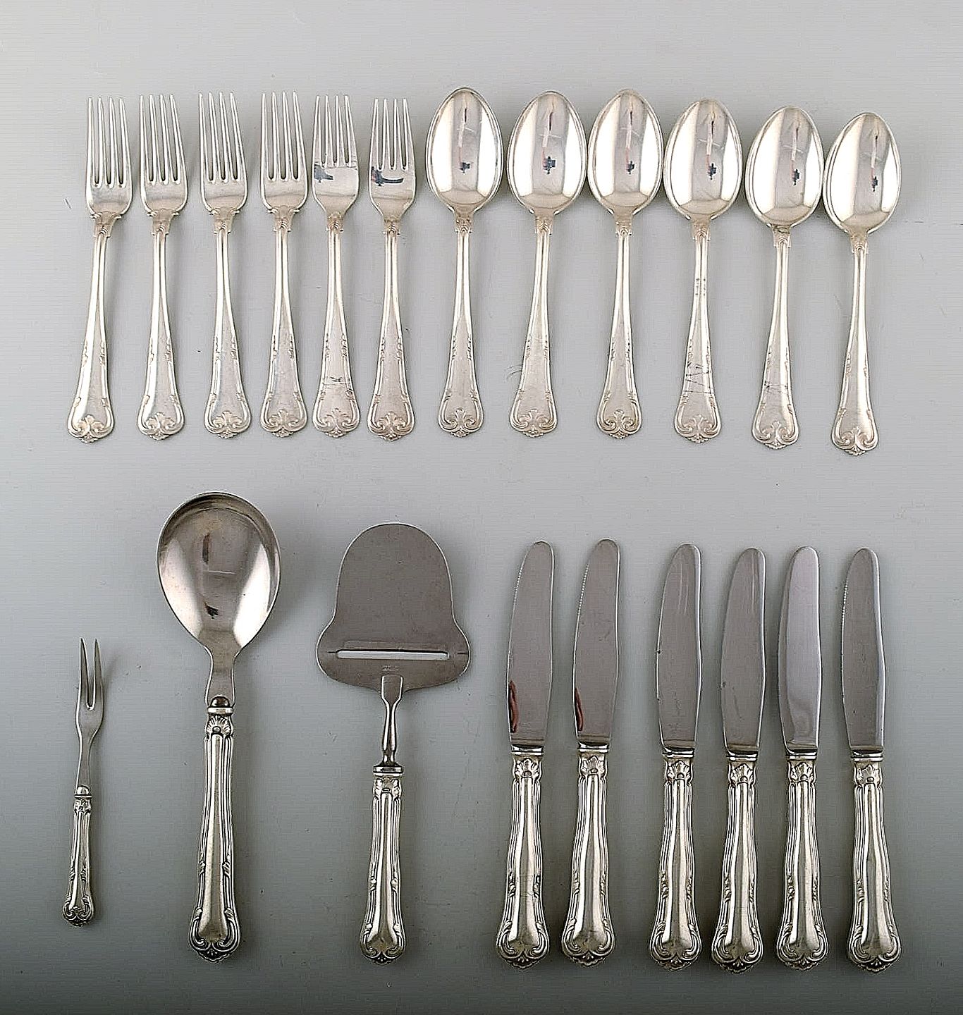 Komplet 3 tårnet sølv frokostservice til 6 p. I alt 21 dele.