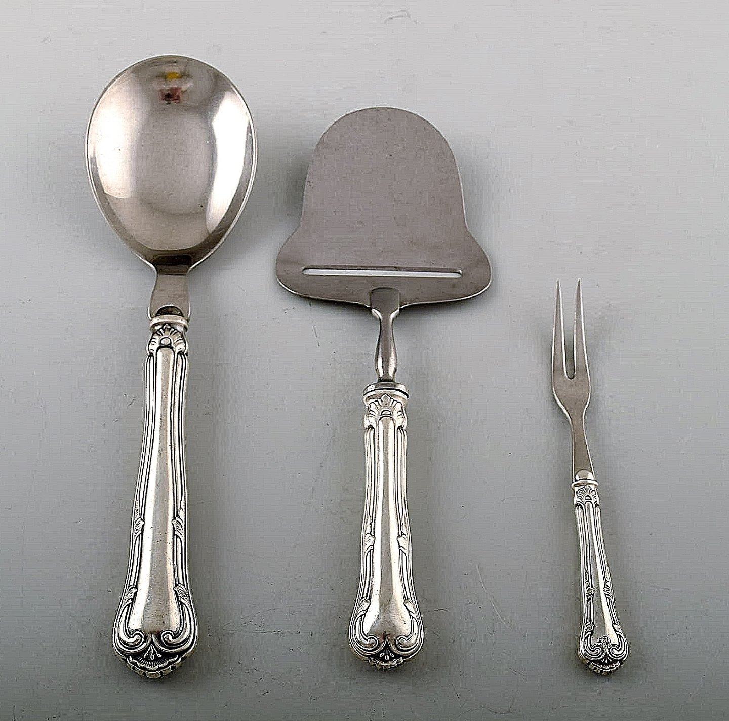 Frokostkniv/gaffel og dessertske samt ostehøvl, pålægsgaffel og serveringsske.