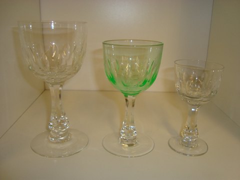 Derby glas, produceret på danske og udenlandske glasværker, klart glas med oliv. slibning og facetsleben stilk. Fra 1890 - 1950