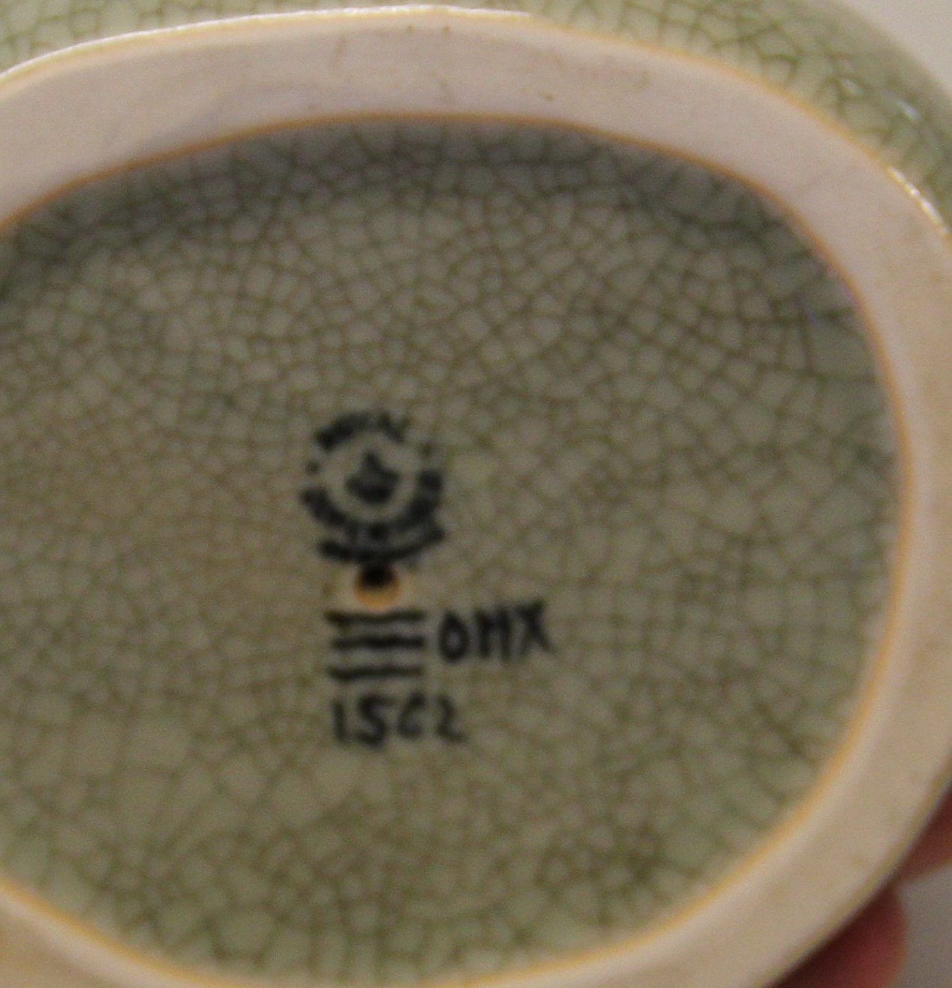 Kongelig Dansk 1562 Kgl. Asiatisk pige med vifte 20 cm ; George Thylstrup, grøn krakkeleret glasur med guld