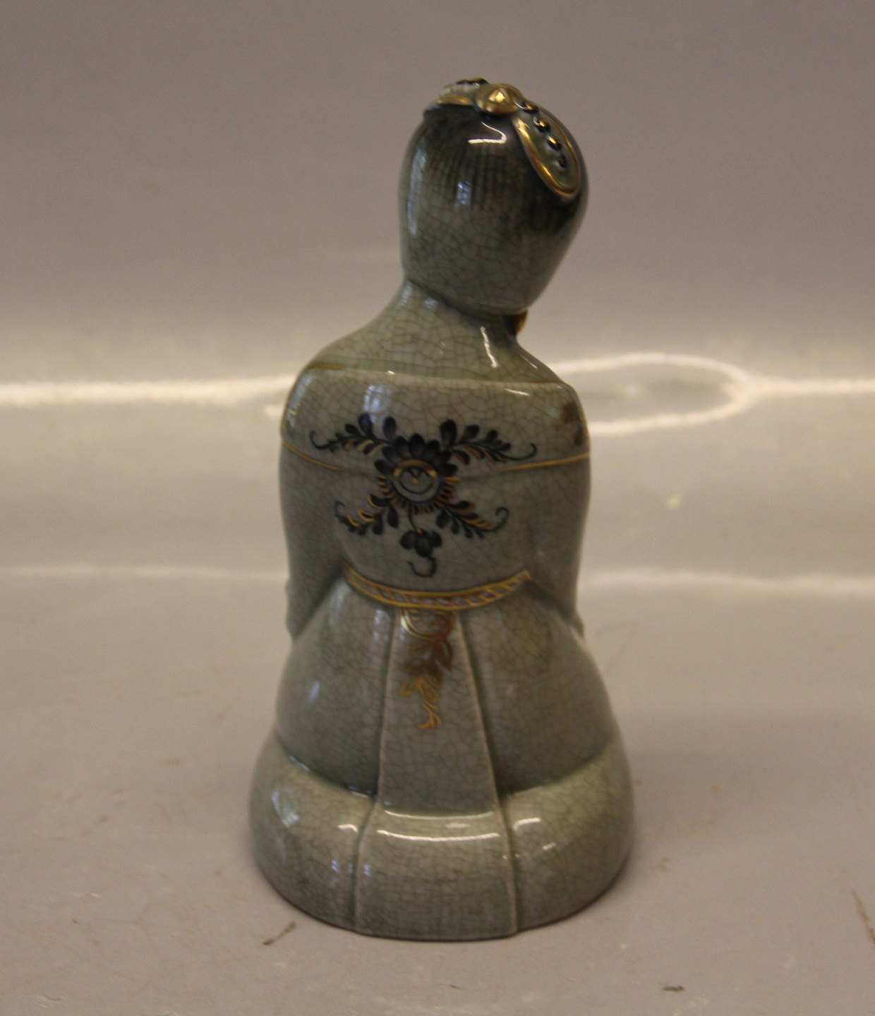 1562 Kgl. Asiatisk pige med vifte 20 cm ; George Thylstrup, grøn krakkeleret glasur med guld fra Royal Copenhagen I hel og fin stand