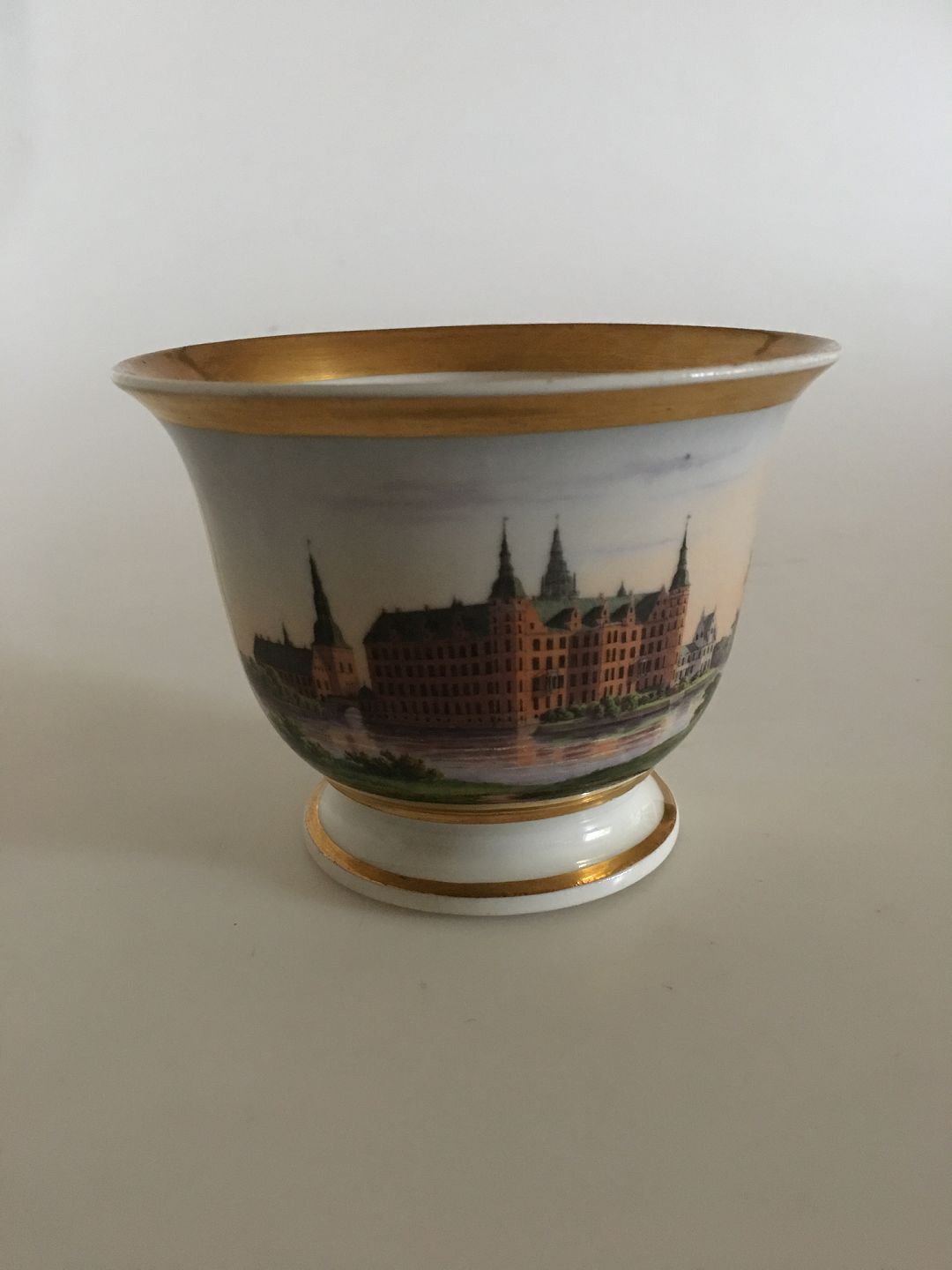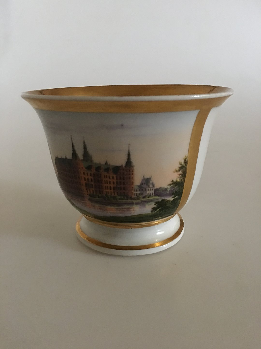 Royal Copenhagen Antik Kop med Håndmalet motiv af Frederiksborg Slot. I flot stand, uden ridser, skår og guldslid. 9 cm Høj. 11.5 cm Ø.