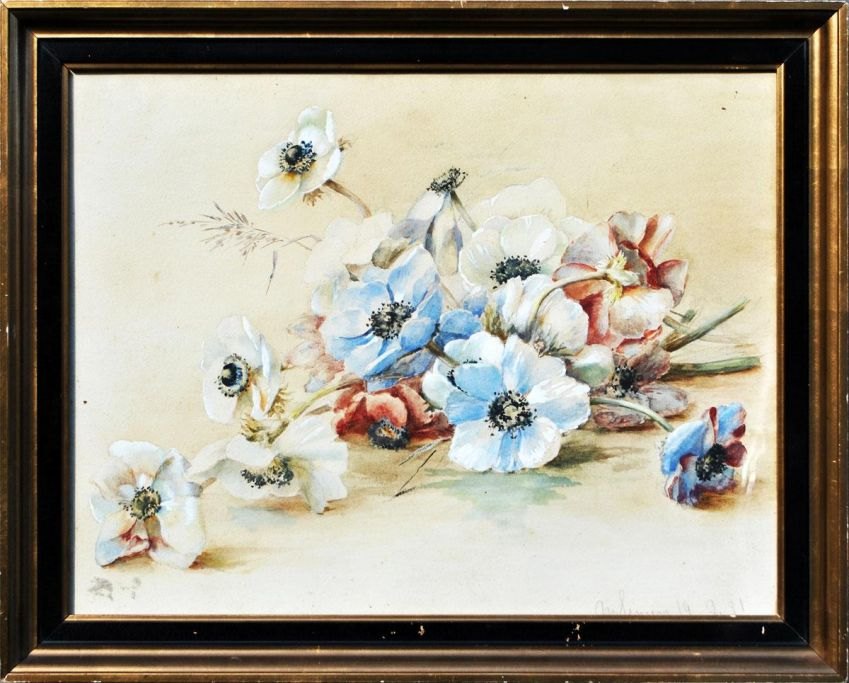 Engelsk kunstner (19. årh.): Opstilling med blomsterbuket på et bord. Signeret: M. Simers 19.3.91. 39 x 49 cm.