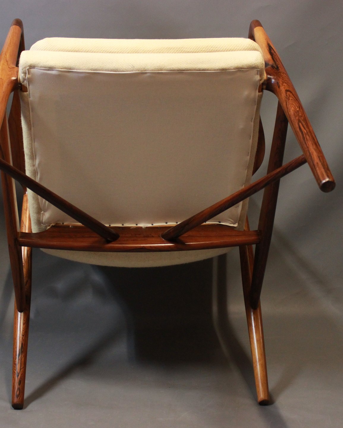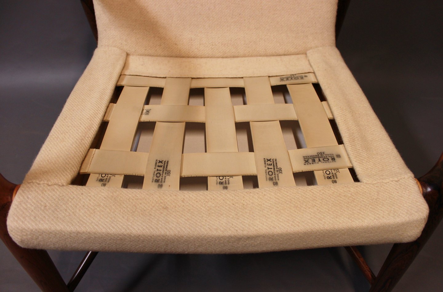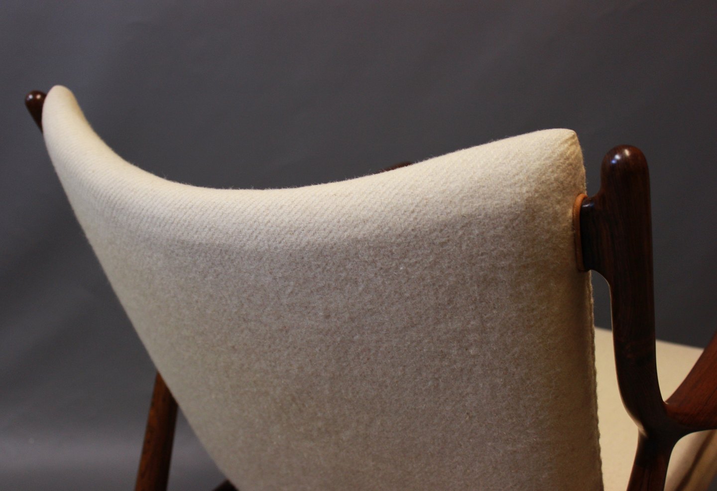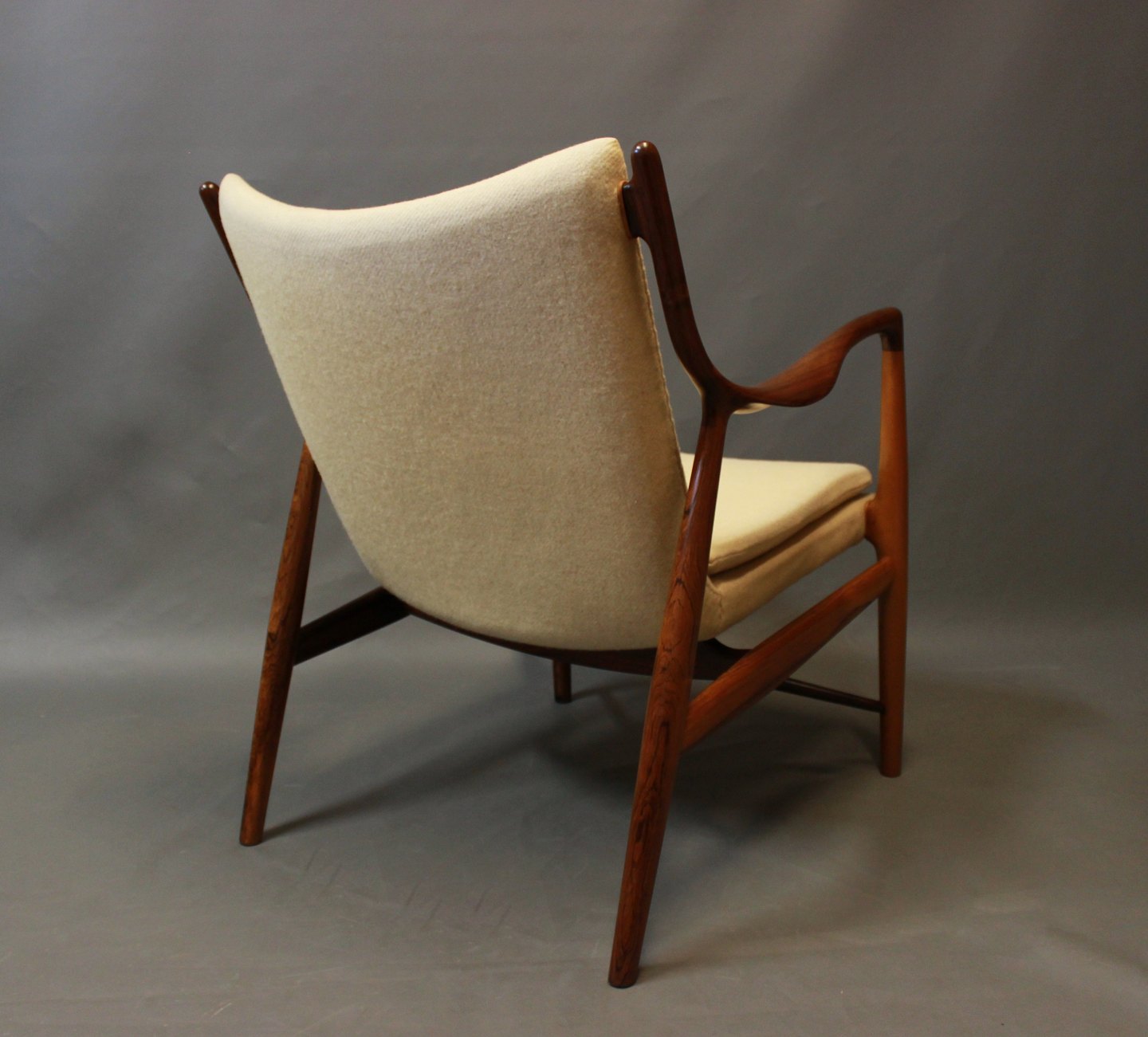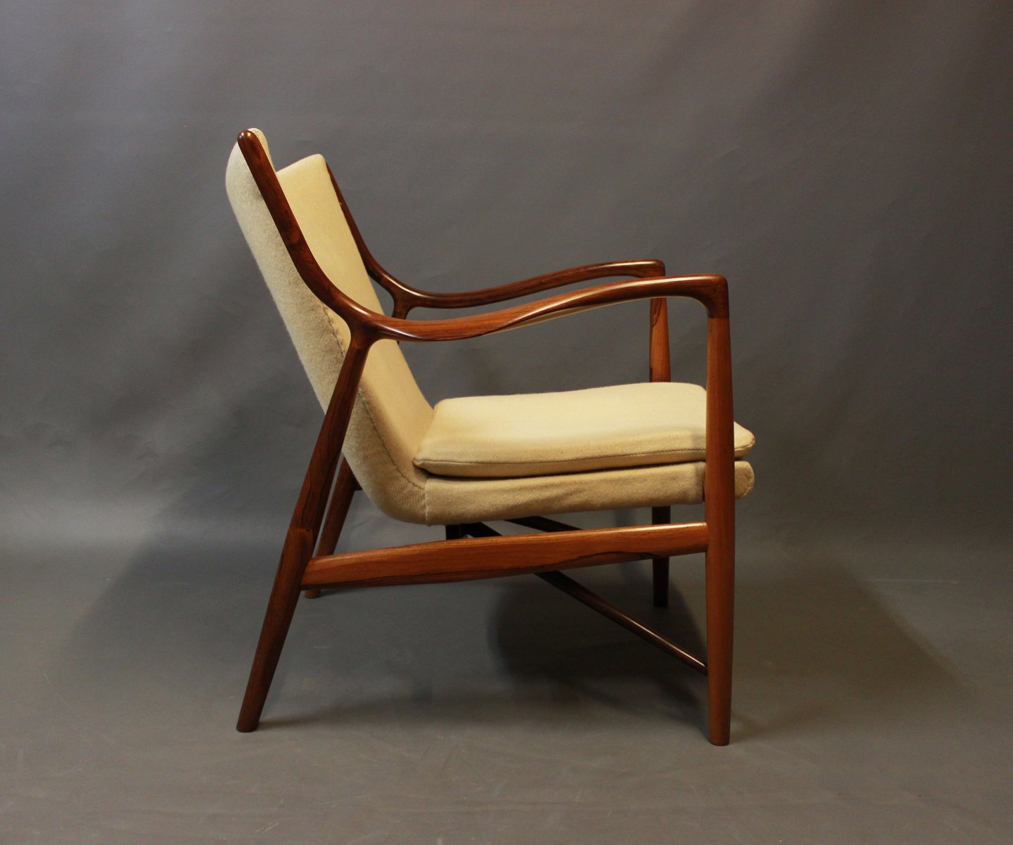 NV45 hvilestolen, designet af Finn Juhl i 1945 og fremstillet af Niels Vodder i slutningen af 1940'erne, er en fremragende repræsentation af dansk modernistisk møbeldesign. Denne stol, lavet af palisander og lyst uld, kombinerer Juhls enestående sans for form og Vodders sublime håndværk.