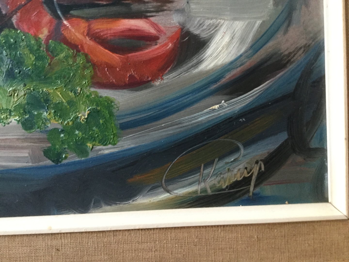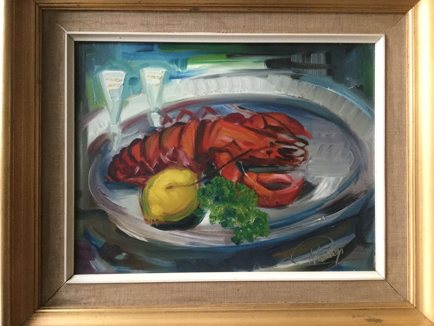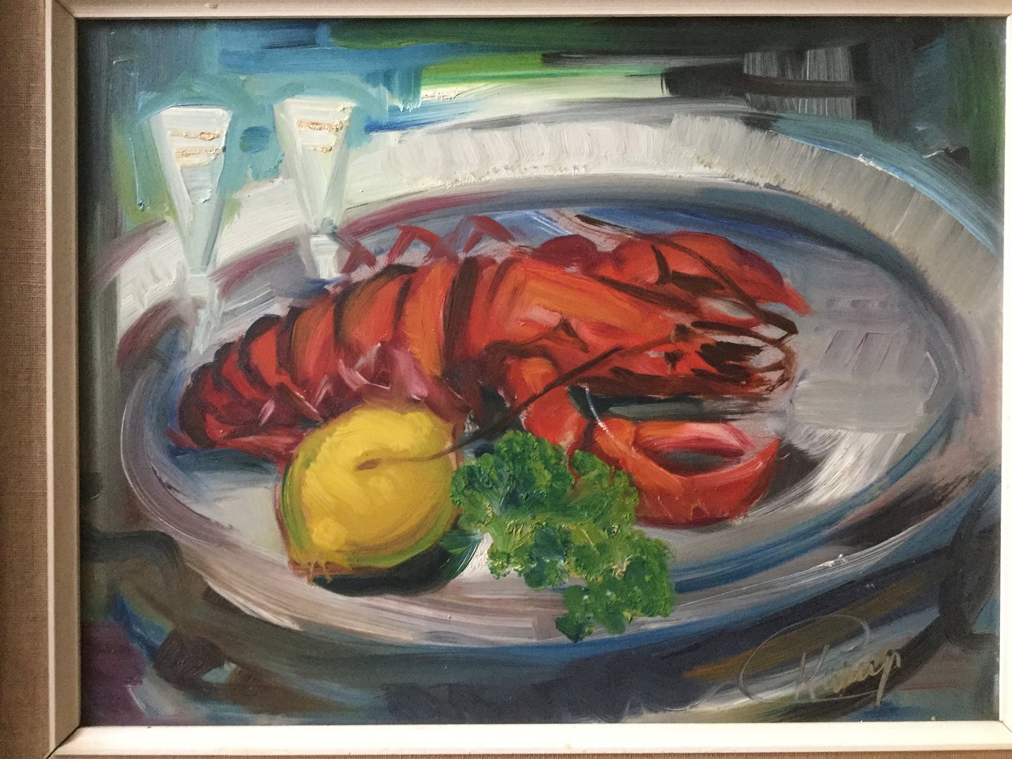 Maleri af Christian Karup Jensen - Opstilling med hummer, citron og snapseglas.