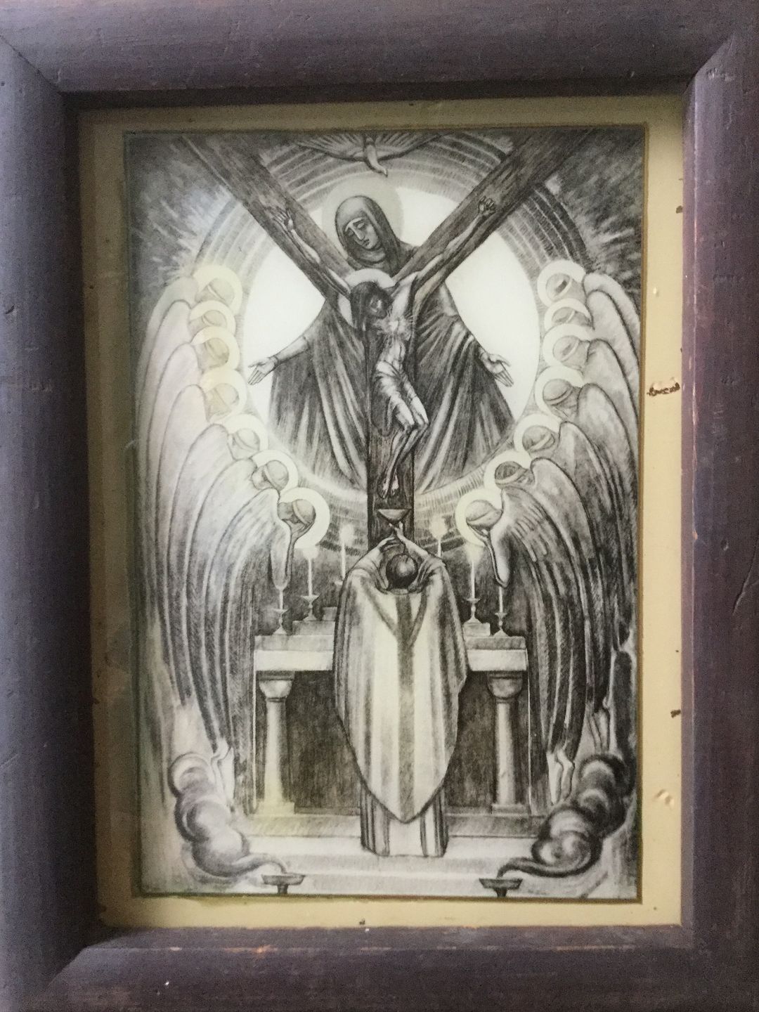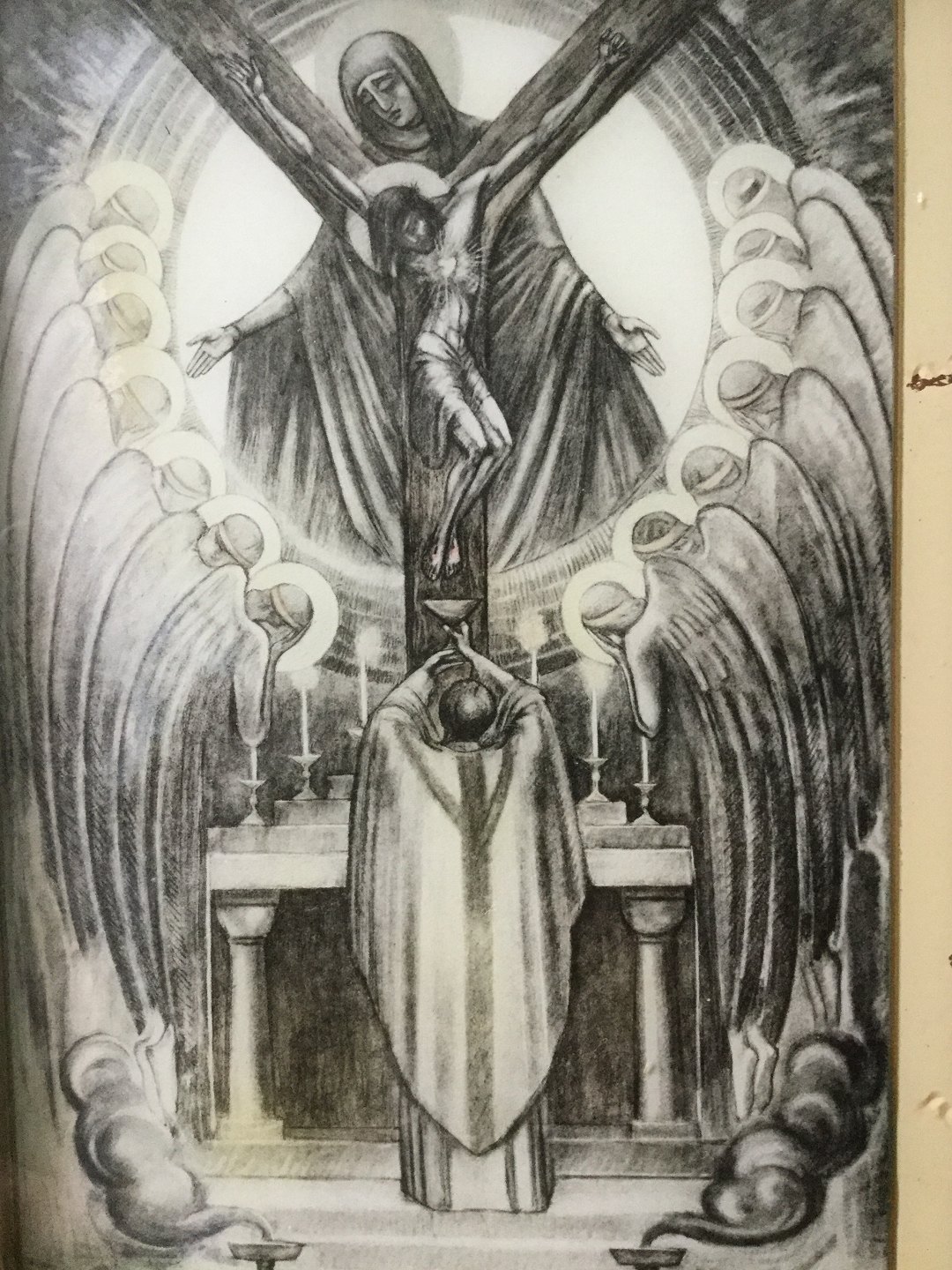 Komposition med indstiftelsen af Nadveren, De 12 disciple, Kristus på korset og Jomfru Maria.