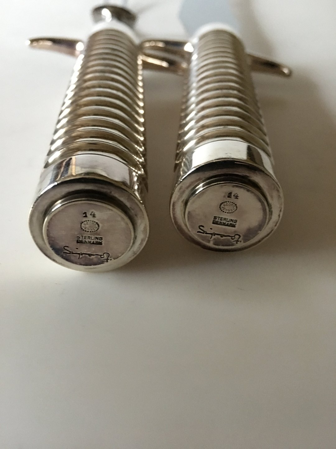 Georg Jensen Forskærer Sæt No. 14 designet af Sigvard Bernadotte. Håndtag i Sterling Sølv, Blad og Gaffel i rustfrit stål. Gaffel måler 26.5 cm L. Kniv måler 31.5 cm L.