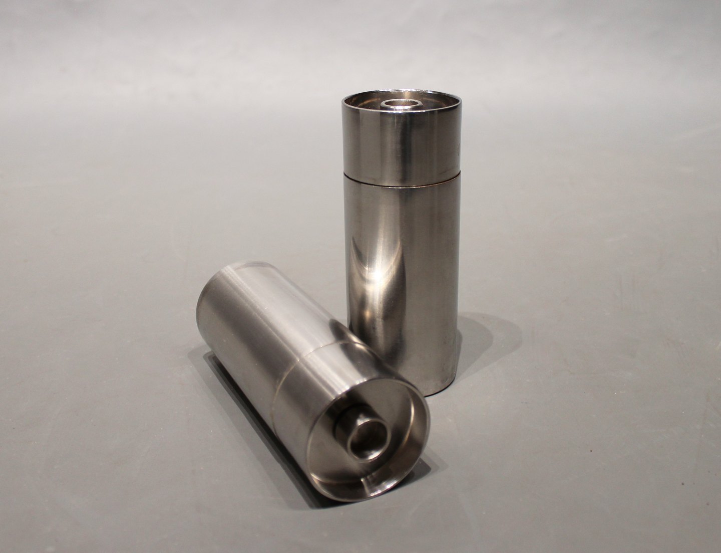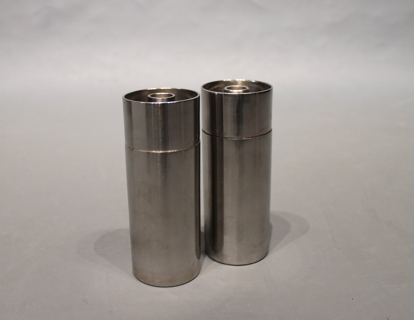 Salt og peberbøsse samt salt og peberkværn fra serien Cylinda Line designed af Arne Jacobsen for Stelton.