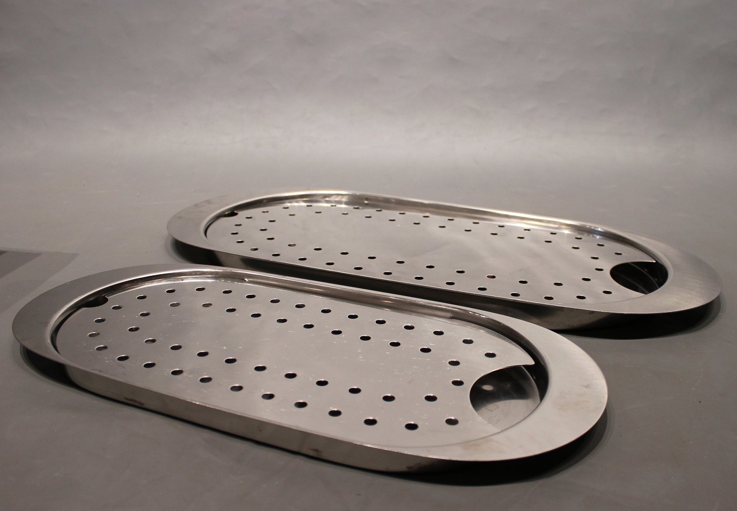 Et par fiskefade i forskellige størrelser i rustfrit stål af Stelton.