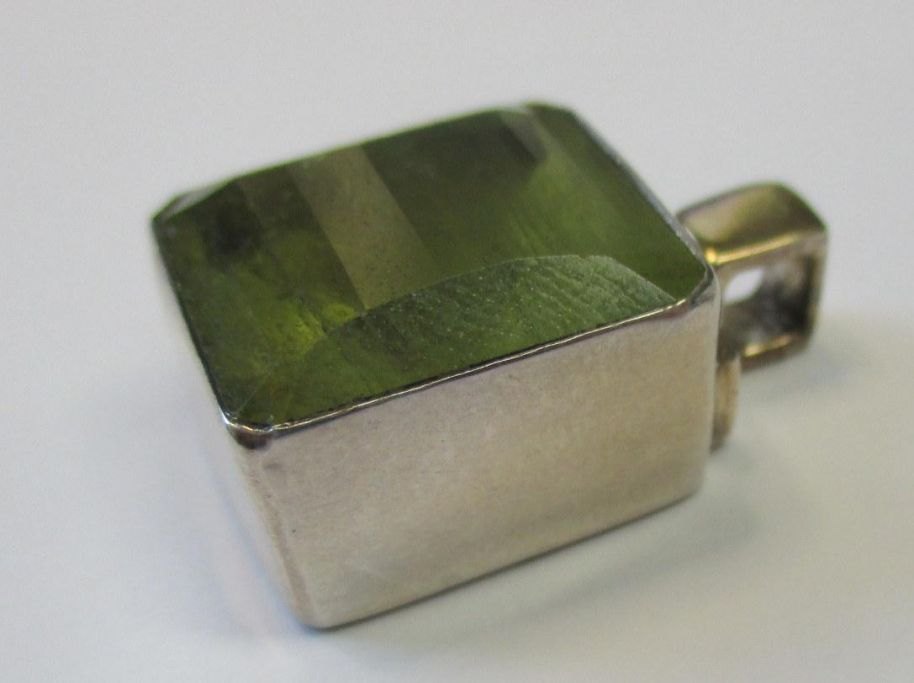 Pendant in silver / gold, Birthe Komselis, Athena (after 1997), Aalborg, Denmark. With green stone. Height: 2.5 cm. B: 1.5 cm. Stamped.