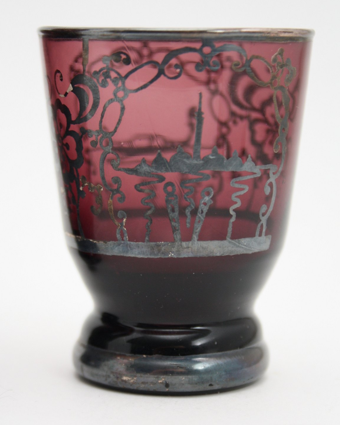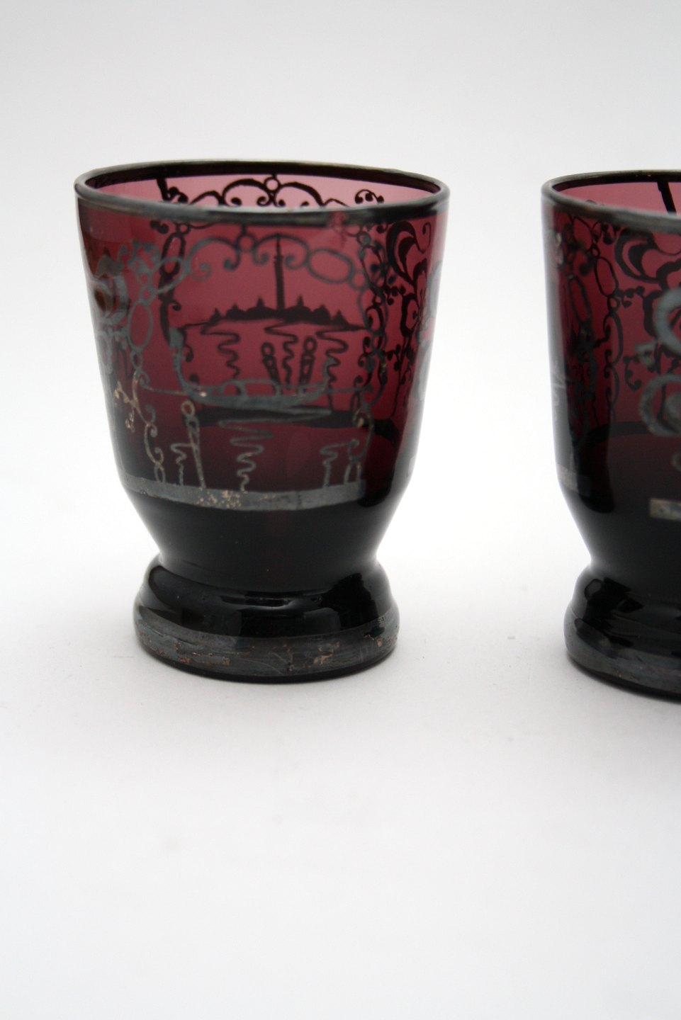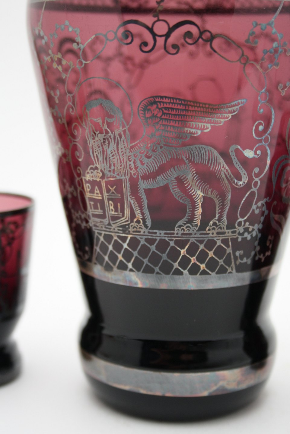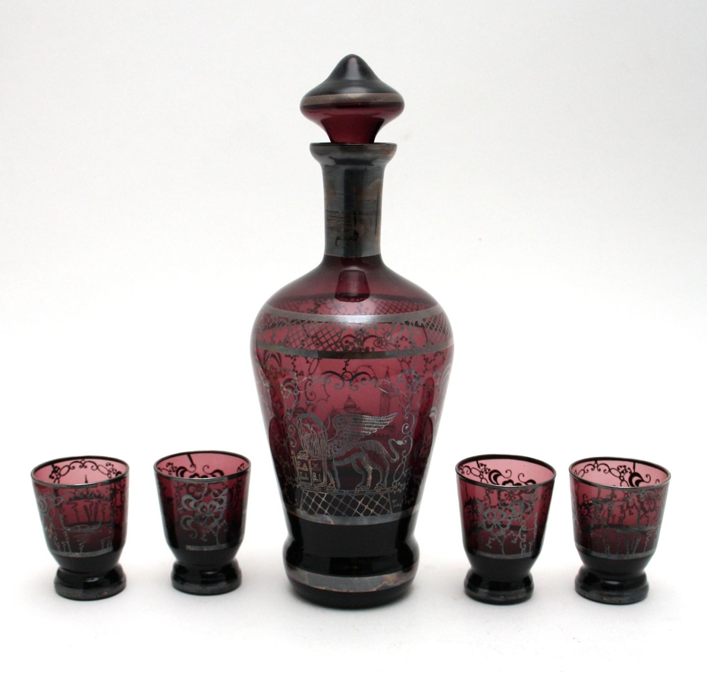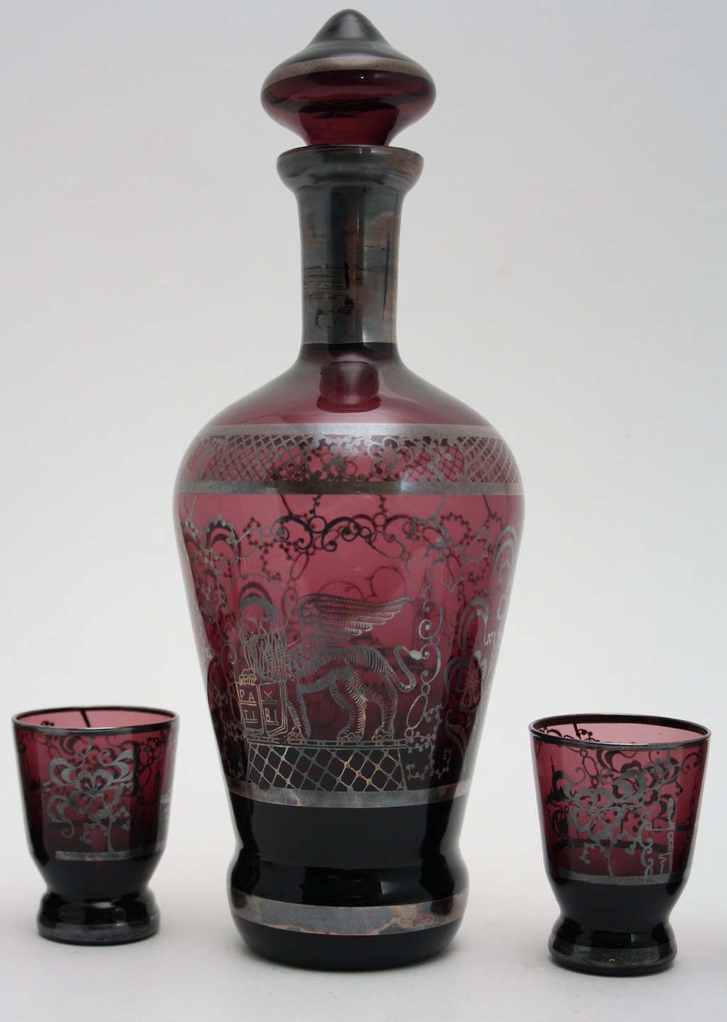 Karaffelsæt i lilla glas med trykte ornamenter.