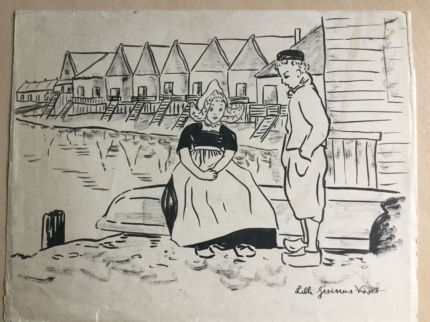 Tegning af Lilli Gésinus-Visser - Ungt par i folkedragter ved strand.