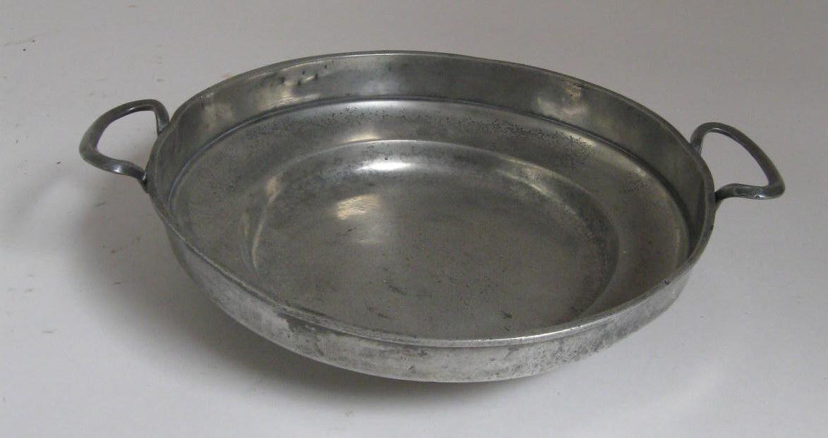 Ear dish in tin, 19th century. With two handles. Stamped with double headed eagle and stamp: SW Fein zinn. Maybe Lübeck? Dia.: 30.5 cm. Length with handles: 36.5 cm. Beautiful condition.