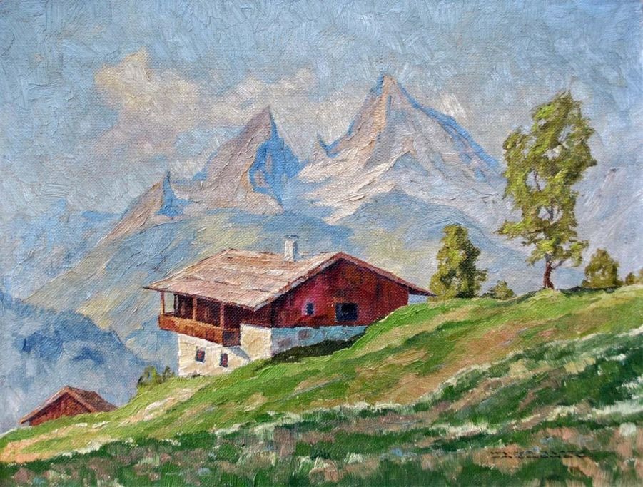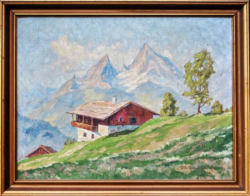 Tysk kunstner (20. årh.) Bjerg landskab. Olie på lærred. Signeret Walter Kravst, München. 31 x 41 cm.