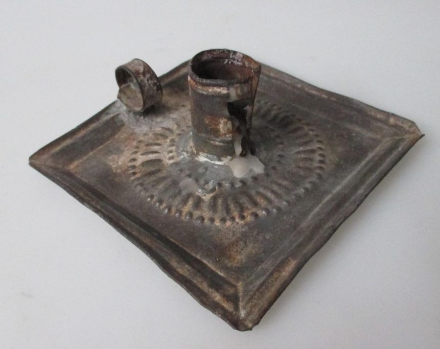 Stage i jernblik, 19 årh. Danmark. Med dekoration og håndtag. Kvadratisk. 11,5 x 11,5 cm.