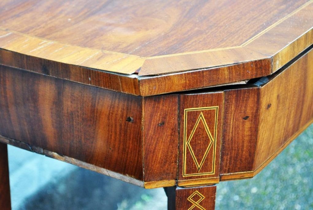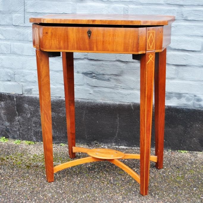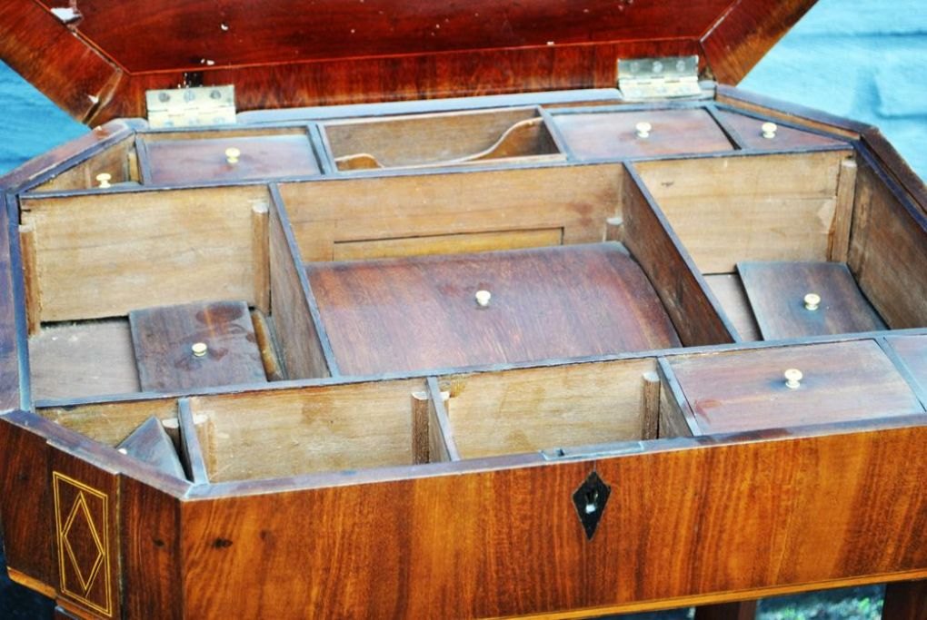 Antikt dansk sy bord i mahogni, senempire. 19. årh. Med intarsia. Under låg talrige rum. H: 70, B: 55, D: 41 cm.