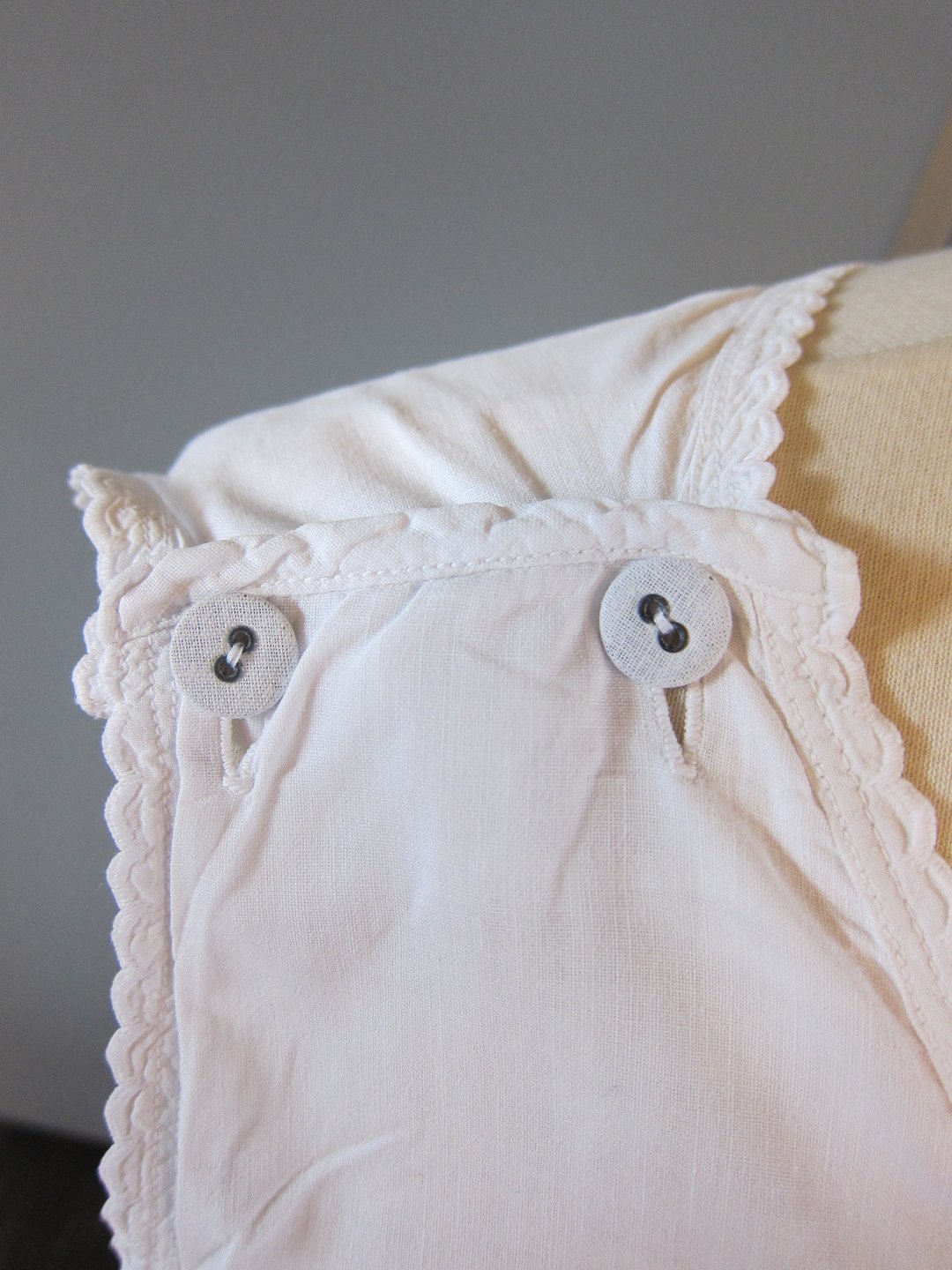 Gammel særk med gamle lærredsknapper, blisser, kile i sidesøm og anden pyntesyning
