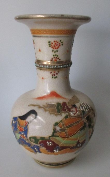 Japansk satsuma vase, 19. årh. Craquele fajance med håndbemalet polykrom dekoration i form af kvinde og spillende mand. H.: 22 cm. Stemplet.