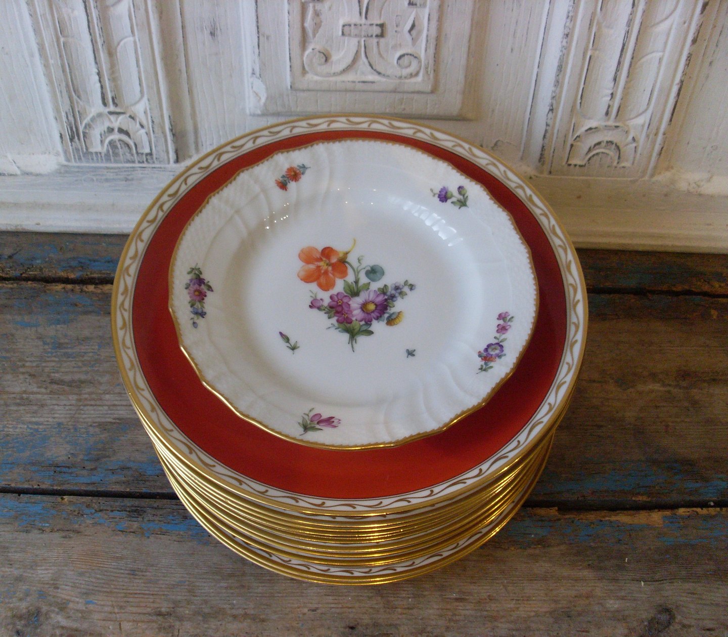 Royal Copenhagen dækketallerkener dekoreret med guld og teglfarvet fane, no. 9785