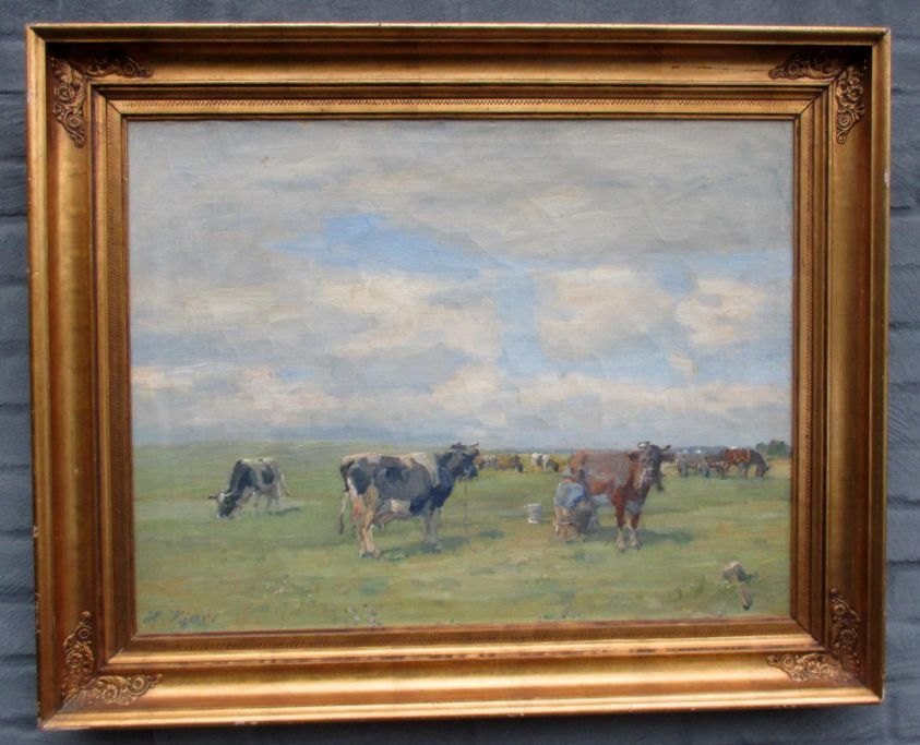 Kjær, Harald (1876 - 1948) Denmark: The cows are milked on the field. Oil on canvas. Signed: H. Kjær. 57 x 72 cm.