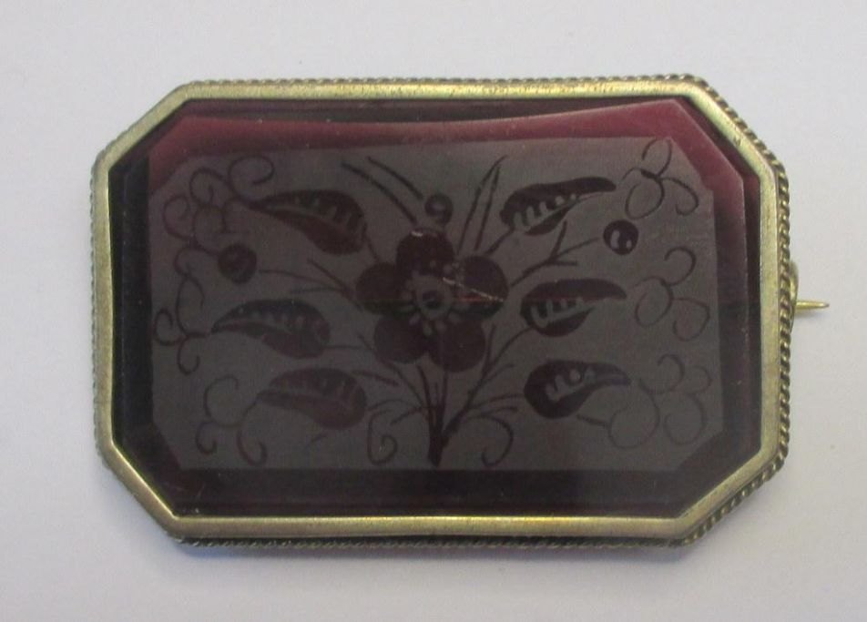 Brosche, ca. 1900. Tyskland. Violet glas med æstninger. Dekorert med blomster. Messing indfatning. 5,5 x 3,5 cm.
