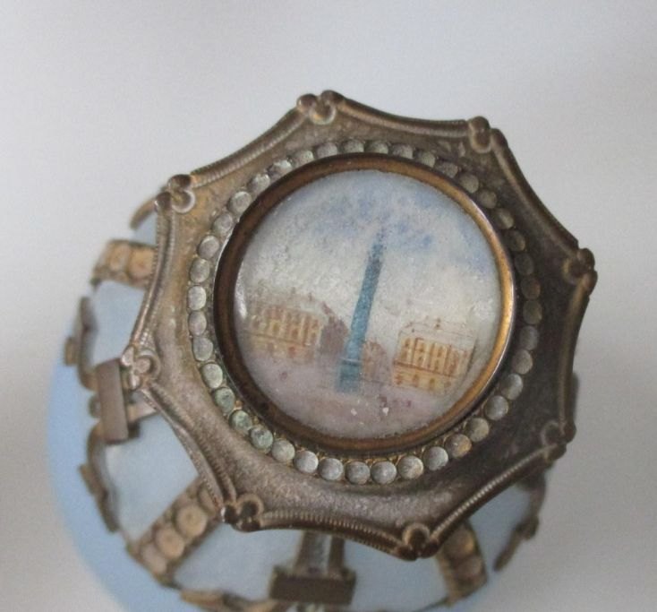 French perfume bottle, 19th century. Light blue opal glass. With brass mounting. With miniature painting from Place Vendome in Paris with the Vendome column from 1810. Height: 11 cm.