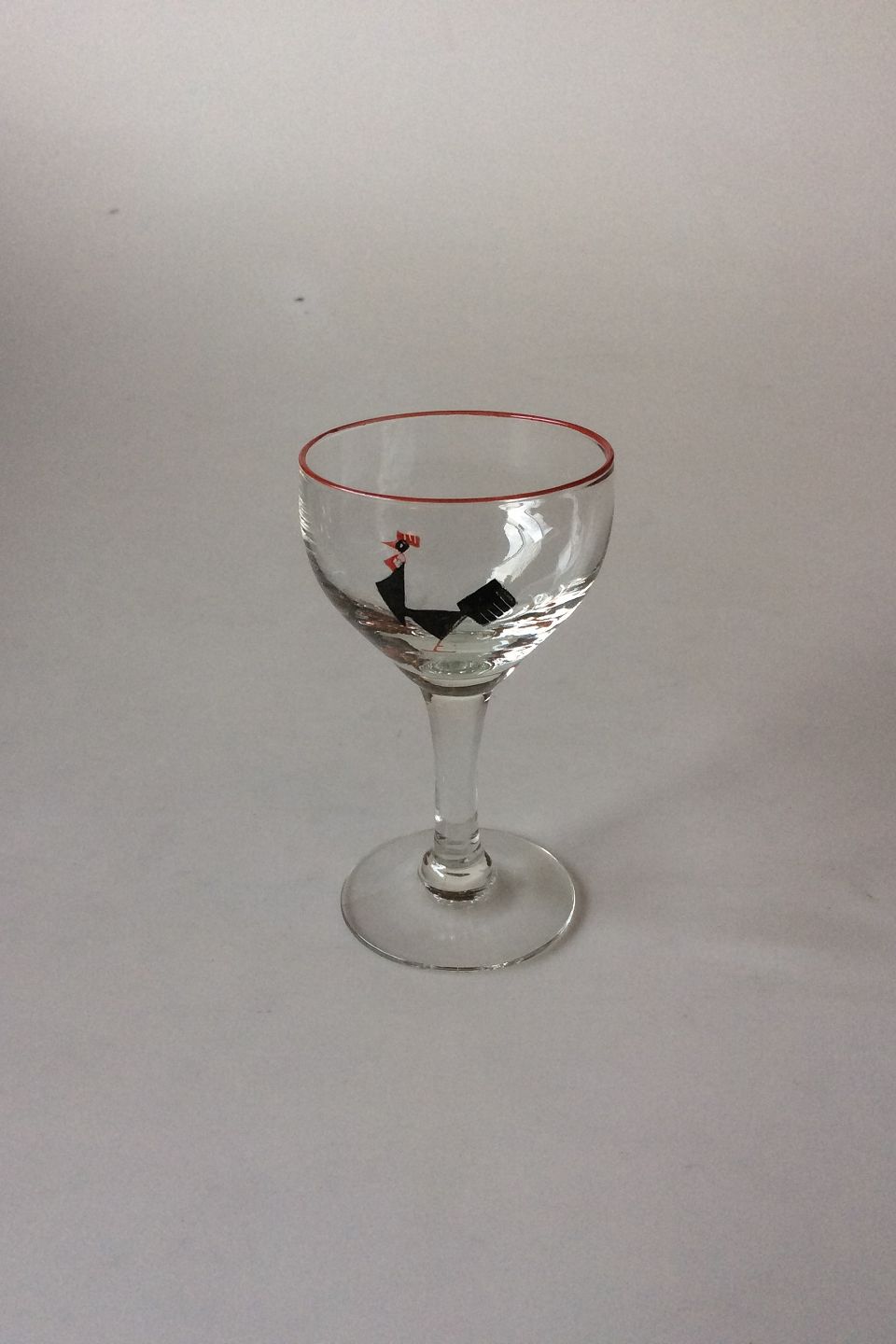 Holmegaard Likørglas dekoreret med sort hane og rød rand.