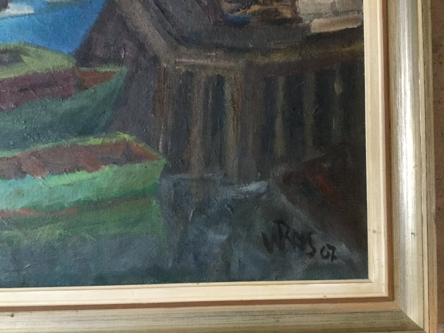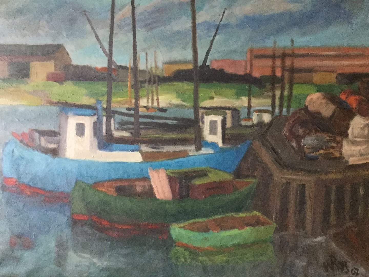 Maleri af William Rasmussen 1967 - Havneparti med både.