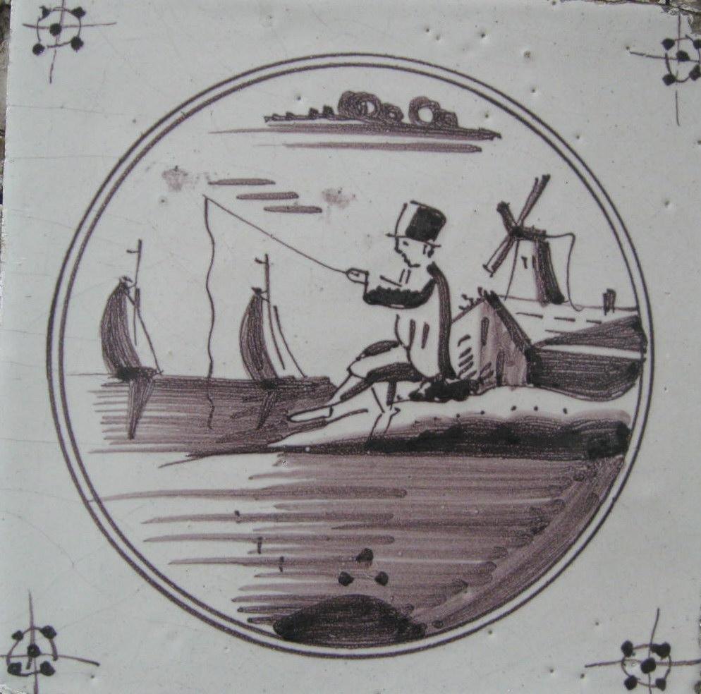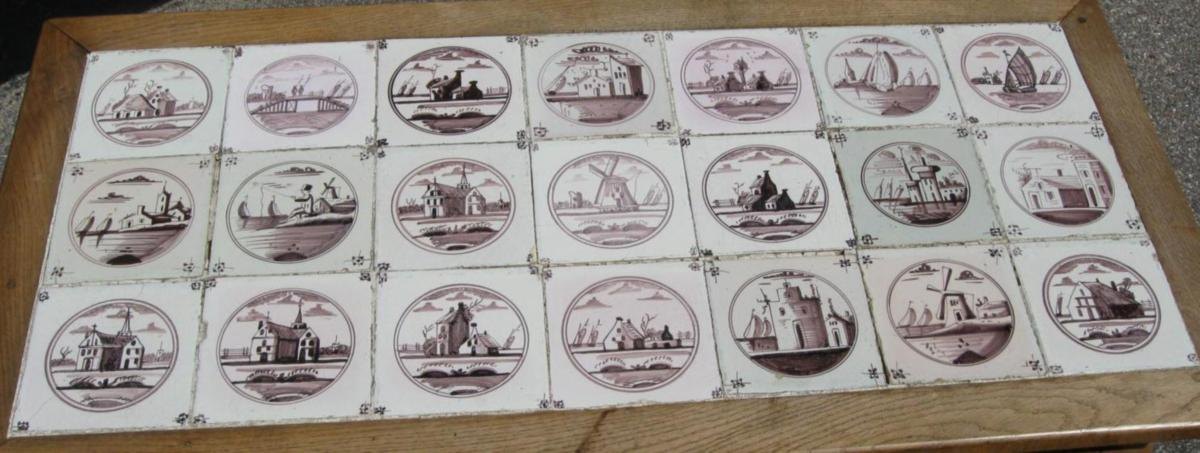 Tiled table with Dutch tiles from the 19th century. Table made as a coffee table in the 1950s in the South of Jutland. The tiles are manganese-colored with figures, landscapes and buildings. Holland, from the period 1800 - 1850, the spider, "n'spinnekop" (dialect). L .: 103 cm, B .: 50 cm, H: 55 cm