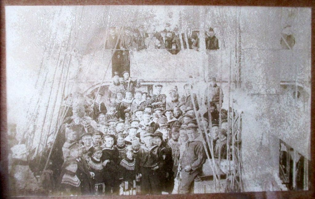 Fotografi af søfolk og grønlændere ombord på et skib. 19. årh