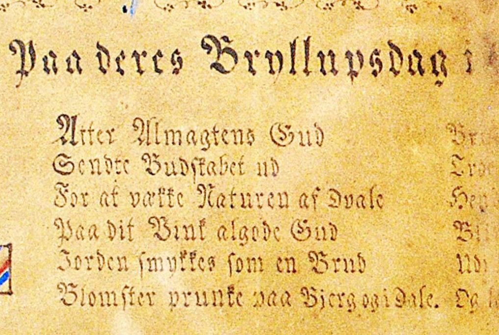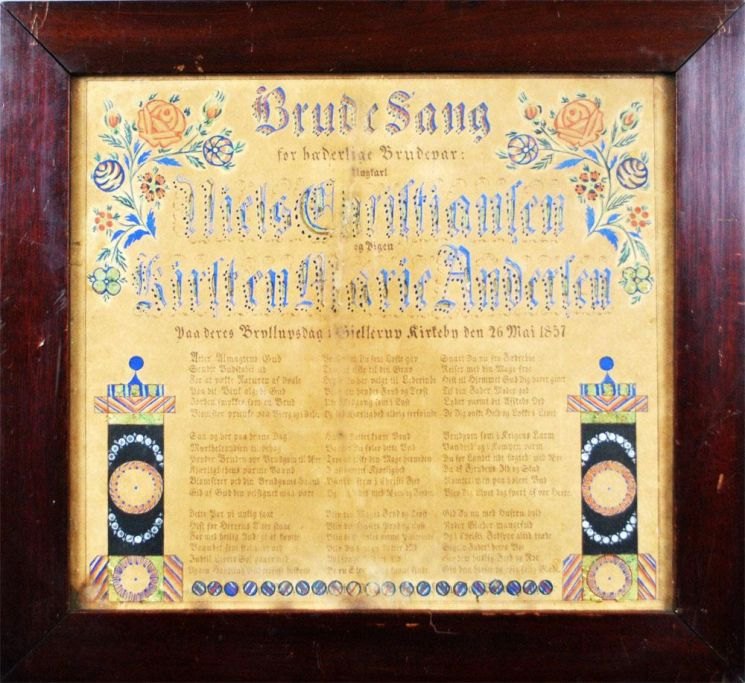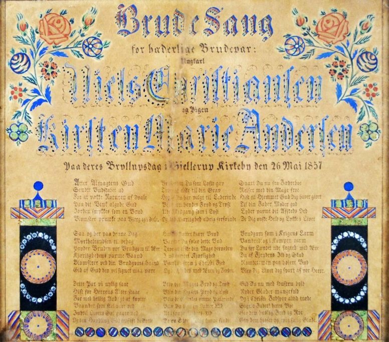 Brudesang for Hæderlige Brudepar, Ungkarl Niels Christiansen og pigen Kirsten Marie Andersen, på Deres Bryllupsdag i Gjellerup Kirke den 26. Mai 1857. 28 x 31 cm. Akvarel - tusch på papir.