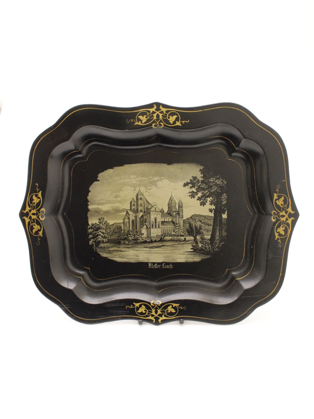 Metal tray 36.5 x 29 cm. decorated with monastery motif 19.th.c No. 328373