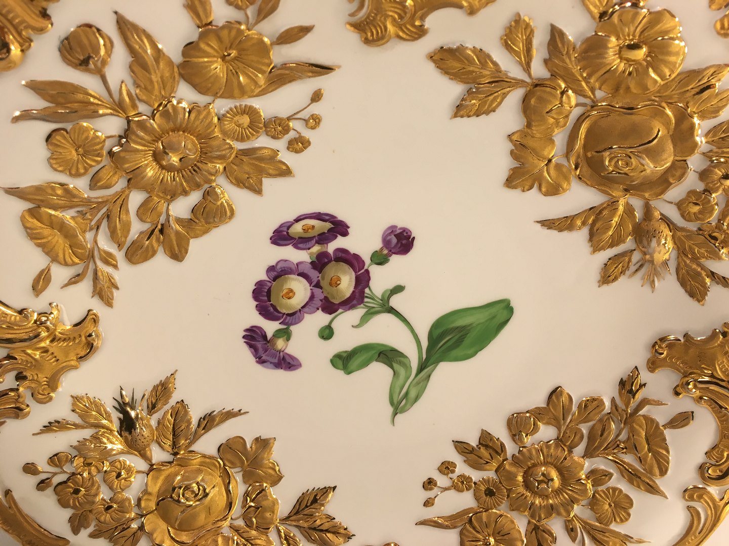 med Forgyldt dekoration i form af Blomster og bemalet blomst midt i faddet.