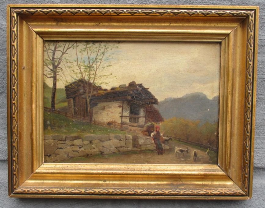 Dansk kunstner (19. årh.): En hyrde i bjergene, Italien. Olie på mahogni. Usigneret. 13,5 x 19 cm.