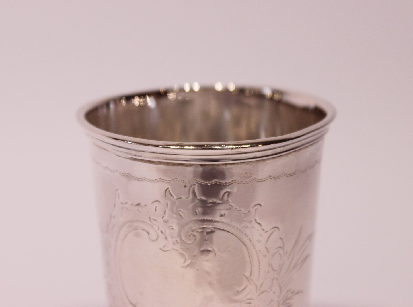 Lille bæger på kugle fødder dekoreret med ciseleringer i 830 sølv fra starten af 1800 tallet.