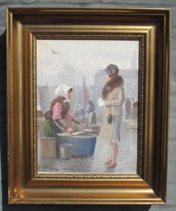 Fischer, Edmund (1889 - 1952) Danmark: Ved fiskekonerne på Gammel Strand. Olie på lærred. Signeret.: Edm. Fischer. 41 x 31 cm.