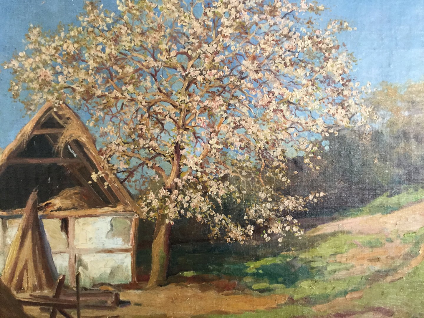 Maleri Edmund Petersen - Gammel faldefærdig gård med blomstrende frugttræ 1919.