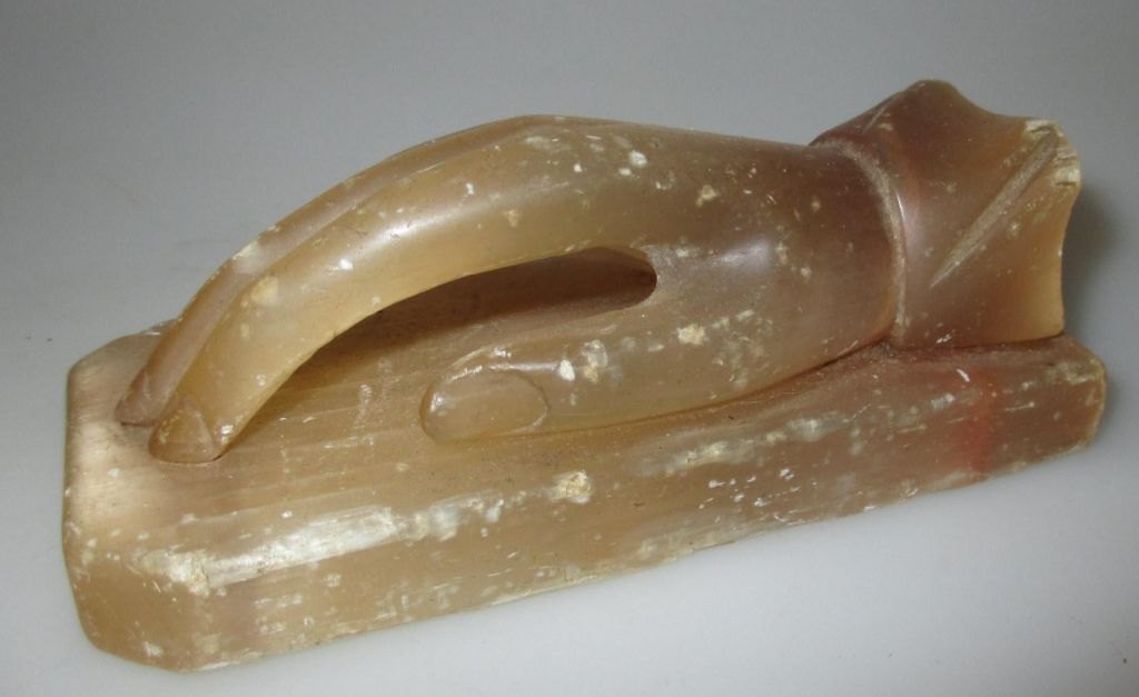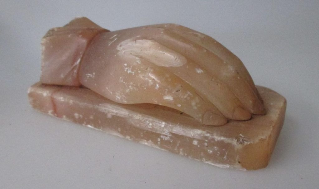 Brev presse i form af liggende hånd, alabast, 19. årh.