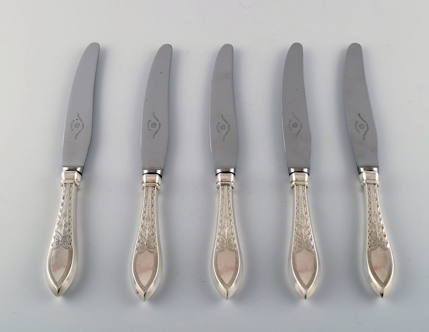 Fem danske middagsknive i tretårnet sølv. ca. 1920.