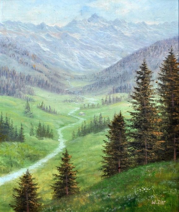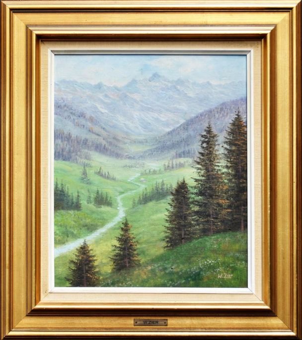 Zier, Wolmer (1910 - 1990) Danmark: Bjerg landskab. Olie på lærrred. Signeret.: W. Zier. 38 x 32 cm.