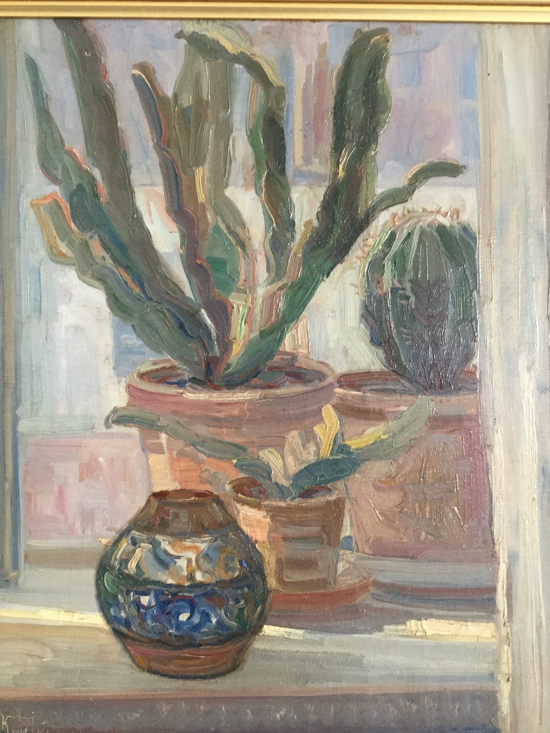 Maleri af Knud Jespersen - Opstilling i vindueskarm med kaktusser og vase 1916.