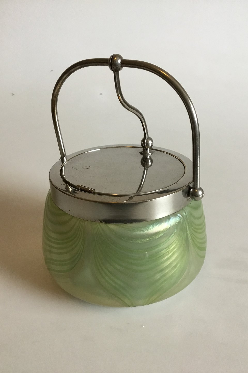 Art Nouveau Sukkerskål/Bonbonniere i lysegrønt iriserende glas med forsølvet låg. Antageligt fra Loetz glasfabrik i Bøhmen. Fra beg. af 1900-tallet. I fin stand.